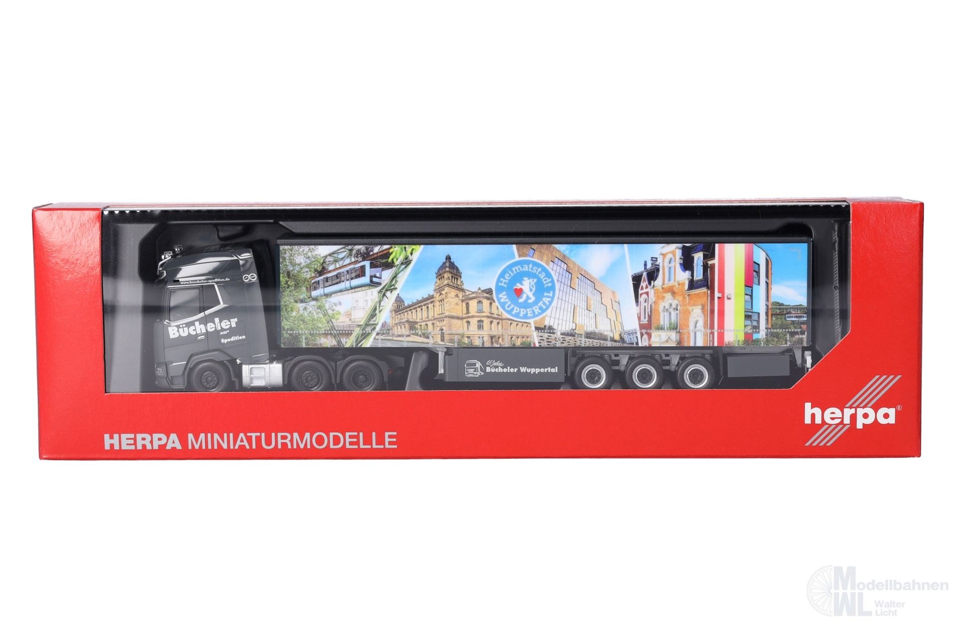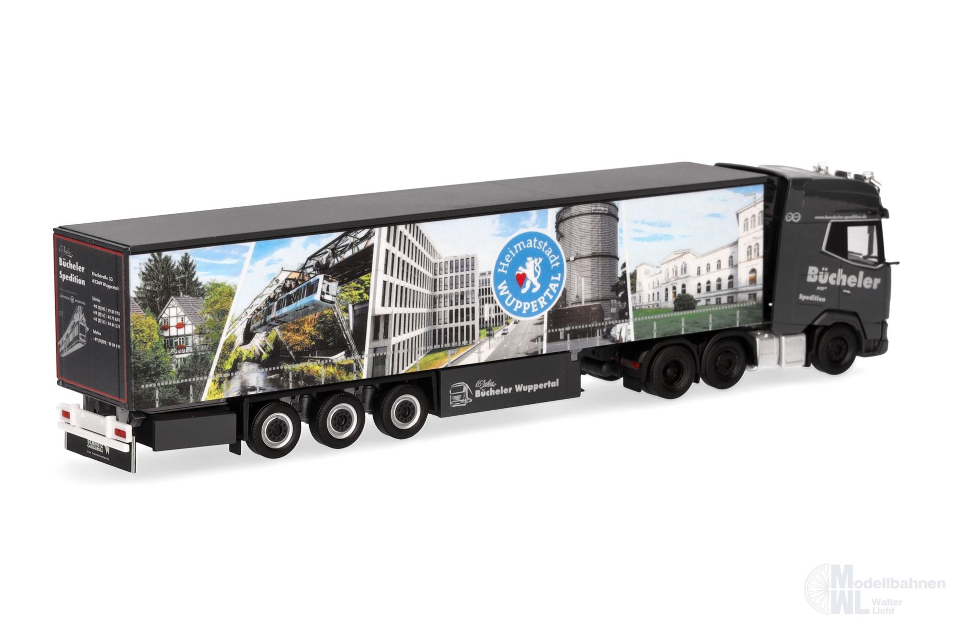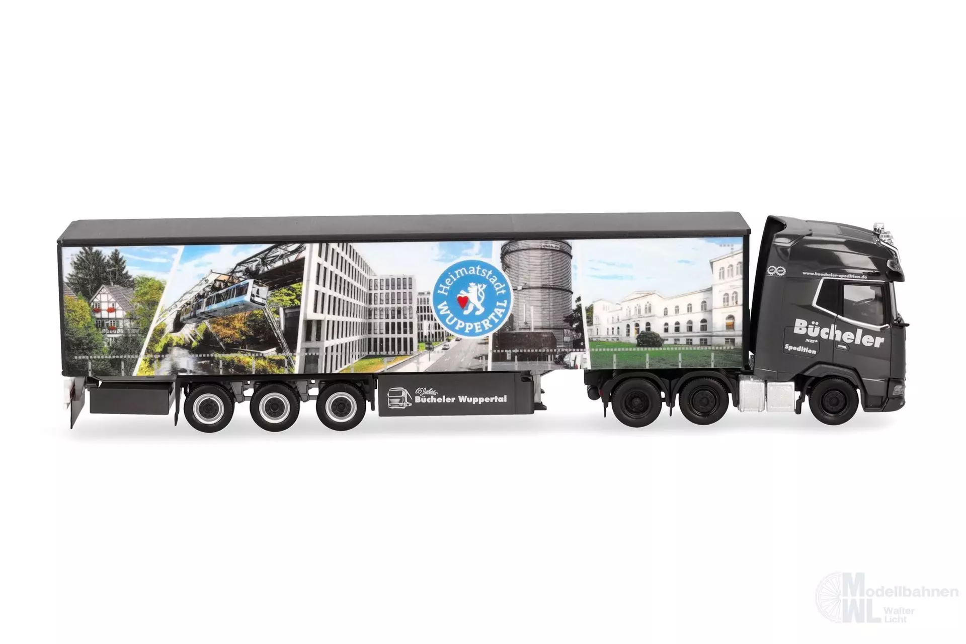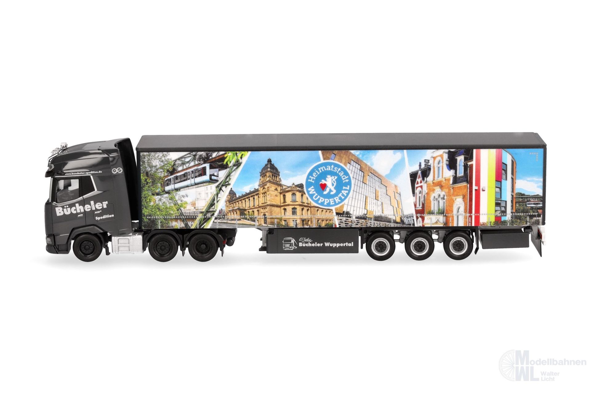 Die Spedition Bücheler aus Wuppertal hat erneut einen Auflieger mit Stadtansichten der Heimatstadt gestaltet. Gezogen wird der Gardinenplanen-Auflieger von einer neuen DAF XG+ Zugmaschine mit Lampenbügel.