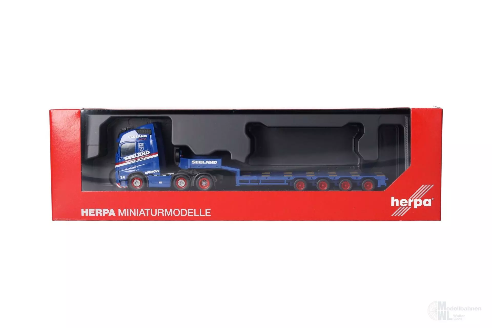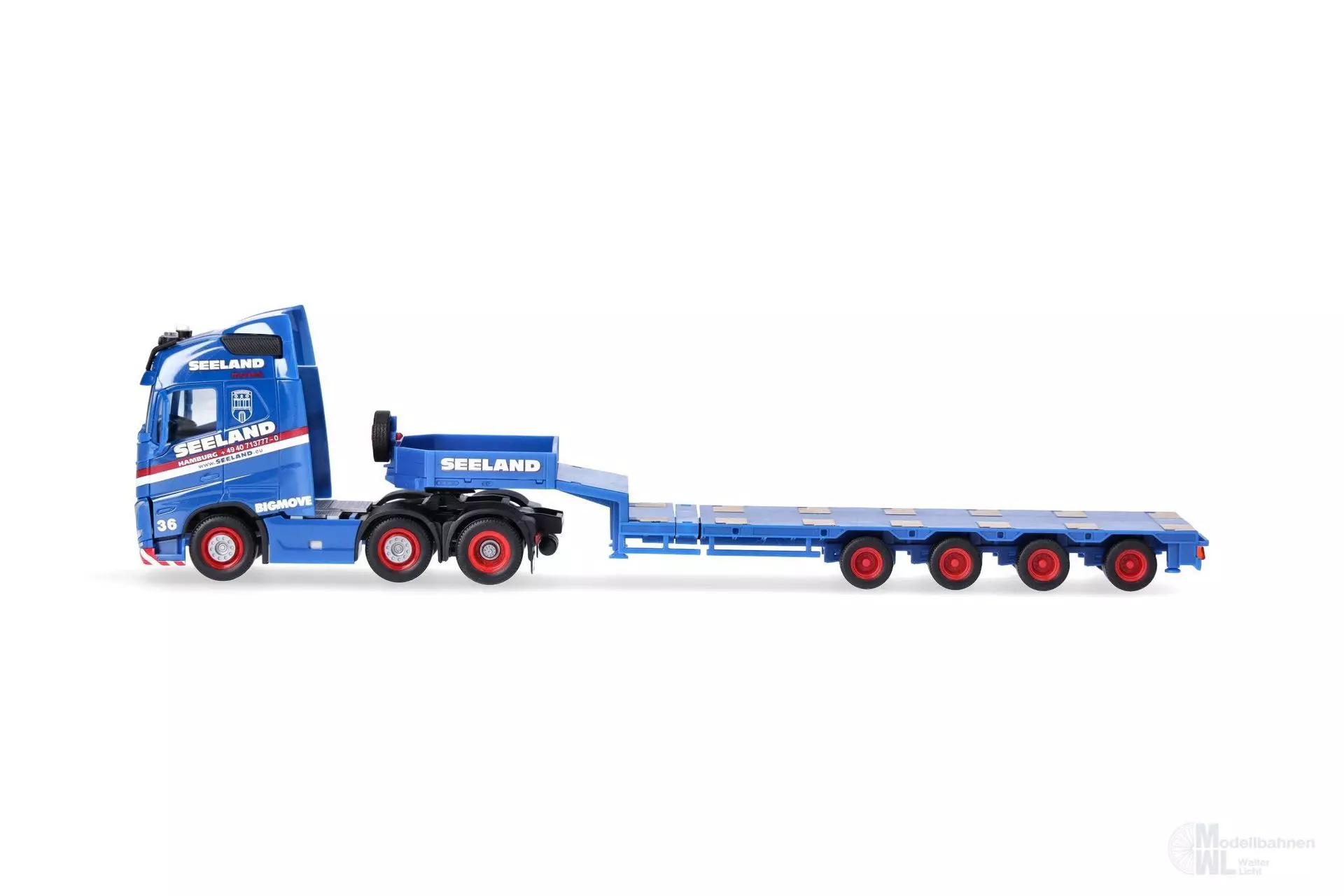 Nach dem spektakulären Modell des Tiefladers mit der Fußgängerbrücke für das Miniaturwunderland in Hamburg als Ladung erscheint bei Herpa das zweite Modell des Schwertransport-Spezialisten Seeland. Der aktuelle dreiachsige Volvo zieht einen vierachsigen Semitieflader und wird in einer einmaligen Auflage gefertigt.