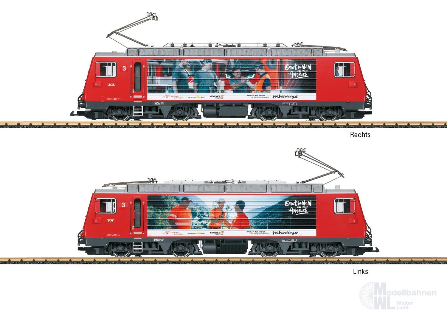 Modell der Elektrolok Nr. 3 "DOM" (Serie HGe 4/4 II) der Matterhorn-Gotthard-Bahn (MGB), wie sie heute noch im Einsatz ist. Originalgetreue Farbgebung und Beschriftung gemäß der Epoche VI. Sonderlackierung mit zwei unterschiedlichen Mitarbeiterwerbungen auf den Seitenwänden der Maschine. Alle 4 Radsätze und zwei Traktionszahnräder von zwei leistungsstarken kugelgelagerten Motoren angetrieben. Ausgerüstet mit einem mfx/DCC-Decoder mit vielen Licht- und Soundfunktionen. Dachstromabnehmer motorisch angetrieben, digital schaltbar. Länge über Puffer 67 cm.