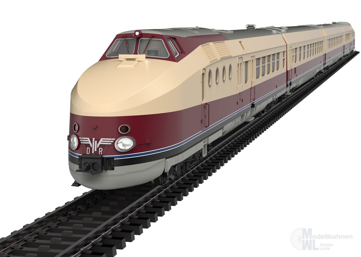 Vorbild: Diesel-Schnelltriebwagenzug Baureihe VT 18.16 (Bauart SVT "Görlitz"), im Zustand der wiederaufbereiteten Museumsgarnitur durch die SVT Görlitz gGmbH. Angelehnt an die Ausführung der Deutschen Reichsbahn der DDR (DR/DDR) aus den 1960er und 1970er Jahren, als Aushängeschild für den internationalen Schnellverkehr. 4-teilige Einheit. 1 Triebkopf VTa, 1 Mittelwagen VMc mit Speiseraum und Küche, 1 Mittelwagen VMd, 1 Triebkopf VTb. Aktueller Betriebszustand ab 2025/26.