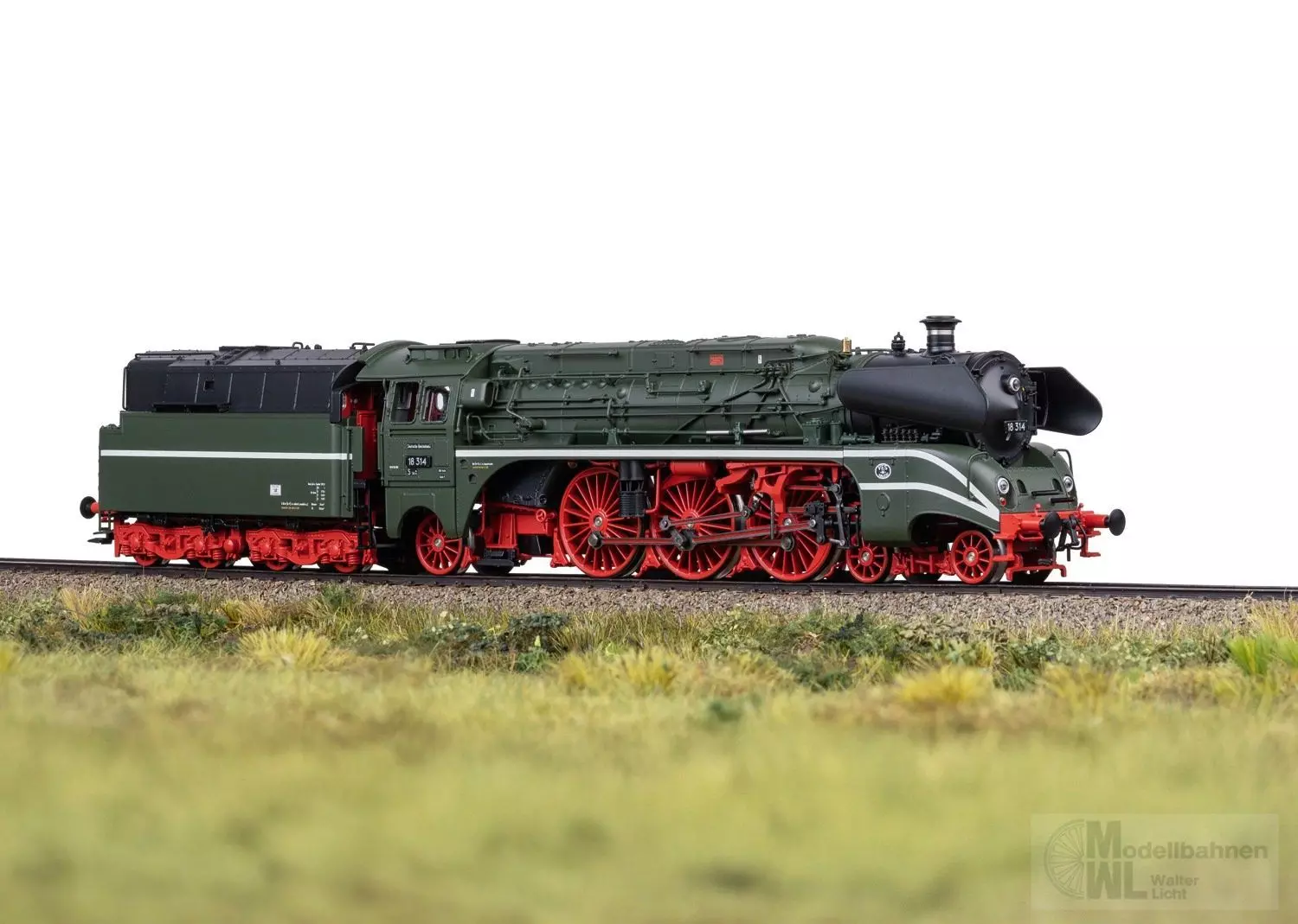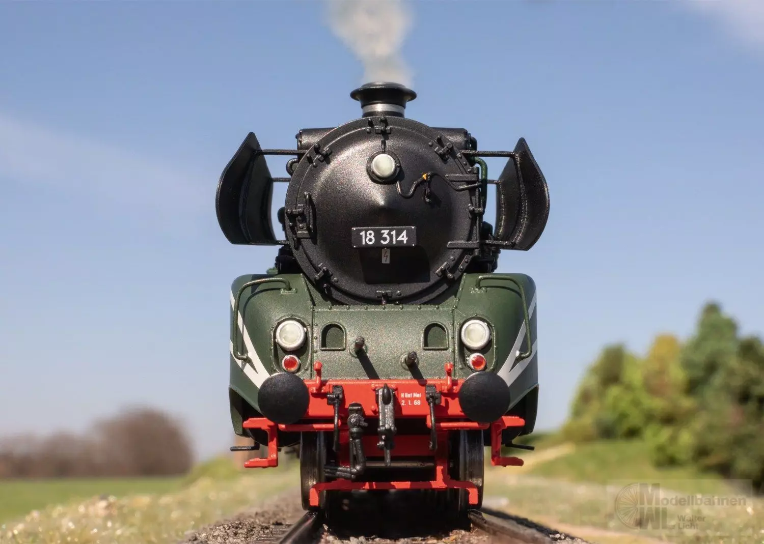 Vorbild: Schnellzug-Dampflokomotive 18 314 mit Öl-Hauptfeuerung und Öl-Tender 2´2´T34 der Deutschen Reichsbahn der DDR (DR/DDR). Umbau-Version als Versuchslokomotive der VES-M Halle (Saale). Ausführung mit Reko-Kessel und Teilverkleidung, auf Basis der Dampflokomotive 18 314 (ehemalige Badische IVh). Mit Witte-Windleitblechen und einseitiger Indusi. Betriebszustand um 1968.