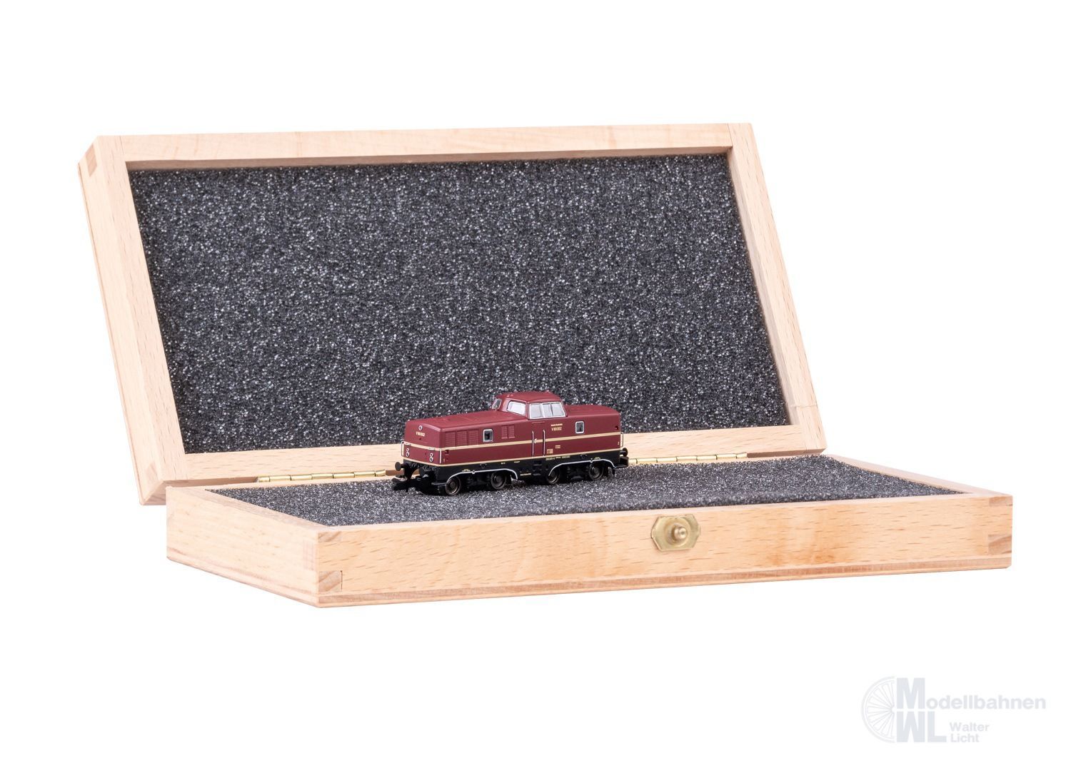 Modell: Ausführung der Epoche III mit runden Metallpuffern. Fahrwerk aus Metall/Kunststoff, Aufbau aus Kunststoff. Vergrößerte Pufferteller. Alle Achsen angetrieben, Glockenankermotor, Dreilicht-Spitzenbeleuchtung mit warmweissen LEDs mit der Fahrtrichtung wechselnd. Dunkel vernickelte Radkränze. Nachbildung Führerstandseinrichtung. Länge über Puffer ca. 58 mm.Verpackt in einer Echtholzbox.