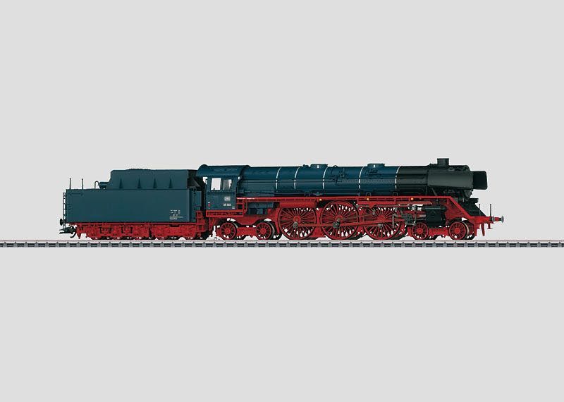 Schnellzug-Dampflokomotive Baureihe 05 der Deutschen Bundesbahn (DB). Fiktive stahlblaue F-Zug-Farbgebung mit schwarzer Rauchkammer. Witte-Windleitbleche und Indusi-Magnet. Blanke Ausführung der Kesselspannbänder. Betriebszustand um 1961.