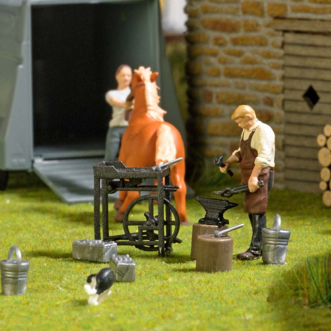 Schweißtreibende Arbeit! Der Schmied bearbeitet auf dem Amboss ein Hufeisen. Action Set mit Schmied, Feldschmiede, Amboss, 2 Hackstöcken, Säcken, Holzstapel, Eimer, Werkzeugkiste und Werkzeug.
