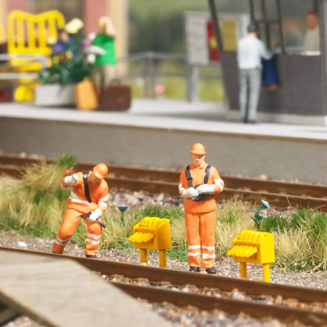 Rangierer mit Fernsteuerung und Wagenmeister bei der Wagenkontrolle in Arbeitskleidung der Epoche 5-6. Action Set inklusive 2 Hemmschuhständer für die weitere Ausgestaltung.