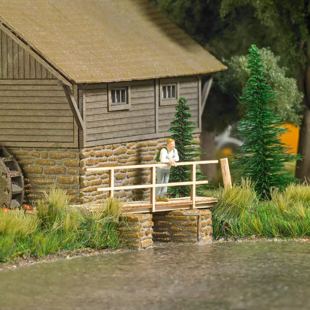 Traumhaft! Der Blick des Wanderers schweift von der Brücke aus über die eindrucksvolle Landschaft! Action Set mit Wanderer, Brücke aus echtem Holz und 3 Bäumen.