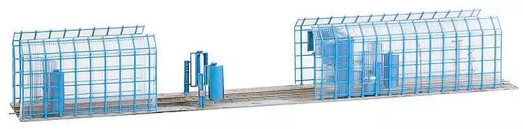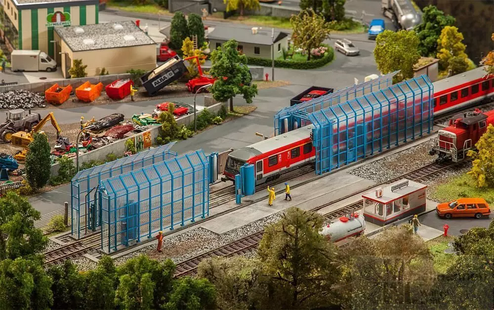 Für Betriebsbahnhof und Depot! Mechanische Zug- und Tramwaschanlage für die Außenreinigung Ihrer Schienenfahrzeuge erspart die Wäsche mit Schrubber und Schlauch. Bei der Durchfahrt erledigen Säulen das Vor- und Nachspülen sowie verschiedene stationäre Seitenwalzen-Paare die Reinigung. Die beiliegende Rahmenkonstruktion ermöglicht die Aufstellung im Freien. Modell ohne Funktion.