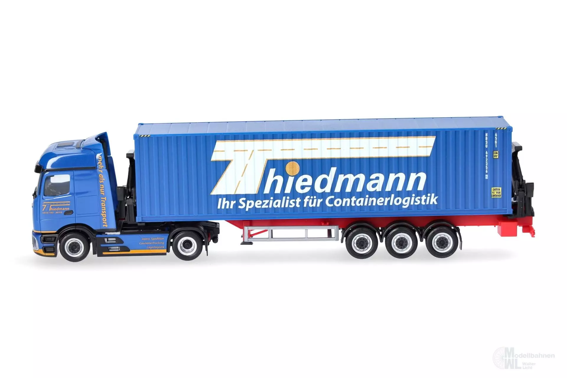 FORMNEUHEIT ! Leutkirch in Bayern ist die Heimat der Spedition Thiedmann, die auf Containertransporte spezialisiert ist. Neu im Fuhrpark des Spezialisten für Containerlogistik ist der Mercedes-Benz Actros ProCabin mit dem bei Herpa neuen Bigspace-Fahrerhaus, der einen beladenen Container-Seitenlader zieht.