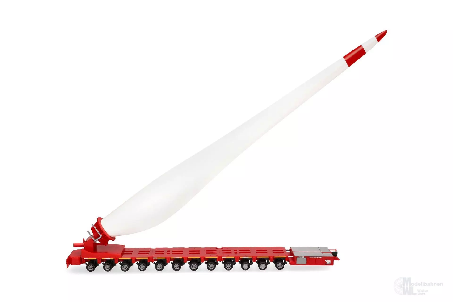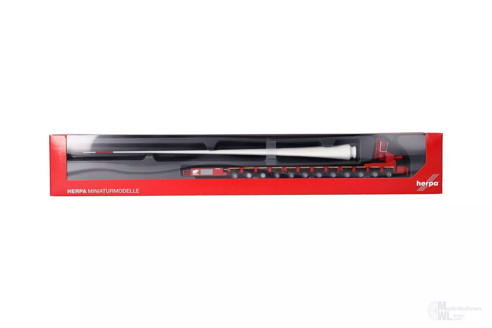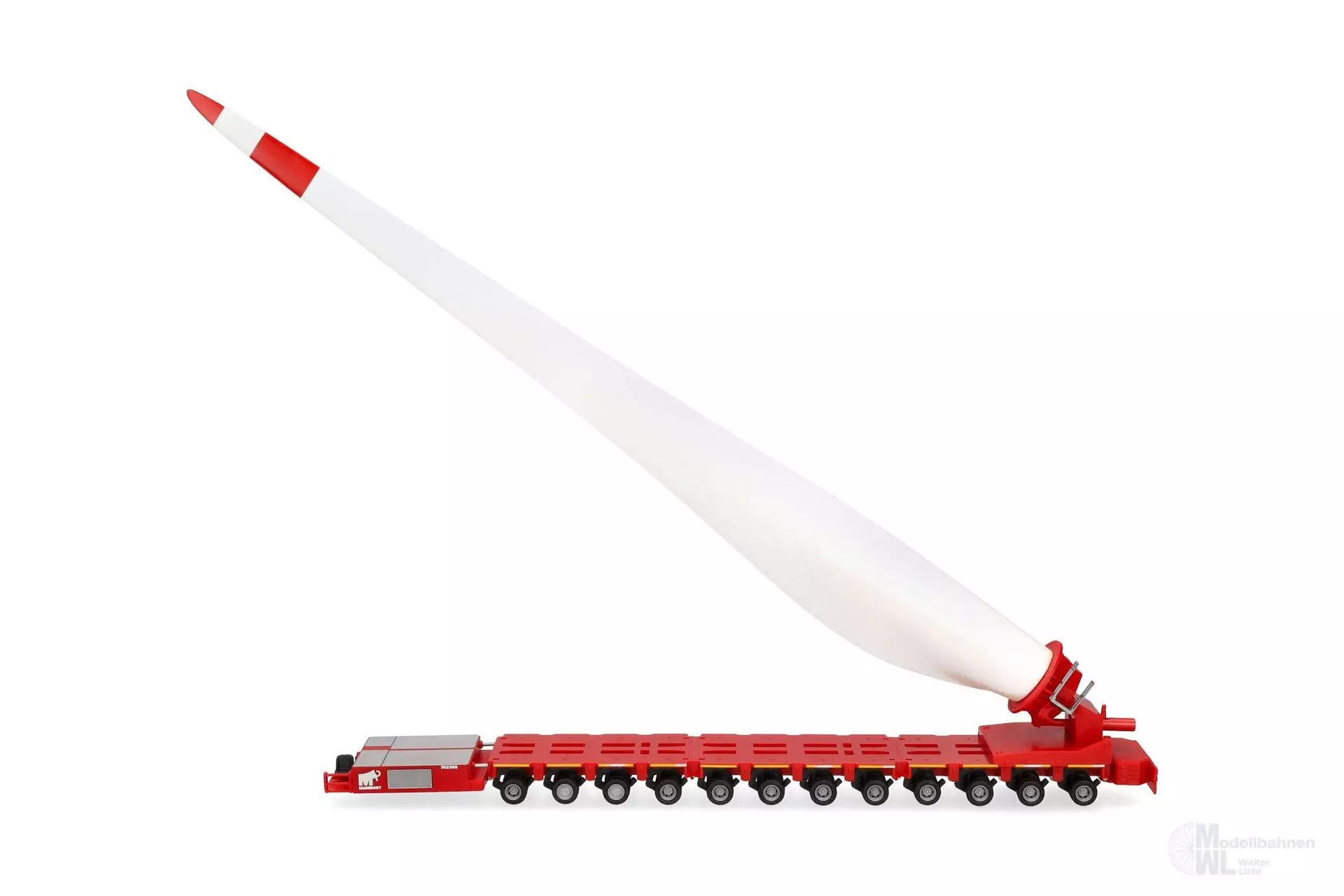 Beladen mit einem Windradflügel ist der Flügeltransporter Goldhofer FTV 300 mit angesetztem Fahrmodul eine beeindruckende Erscheinung, die bei Herpa im Design des Unternehmen Mammoet in einmaliger Auflage angeboten wird.