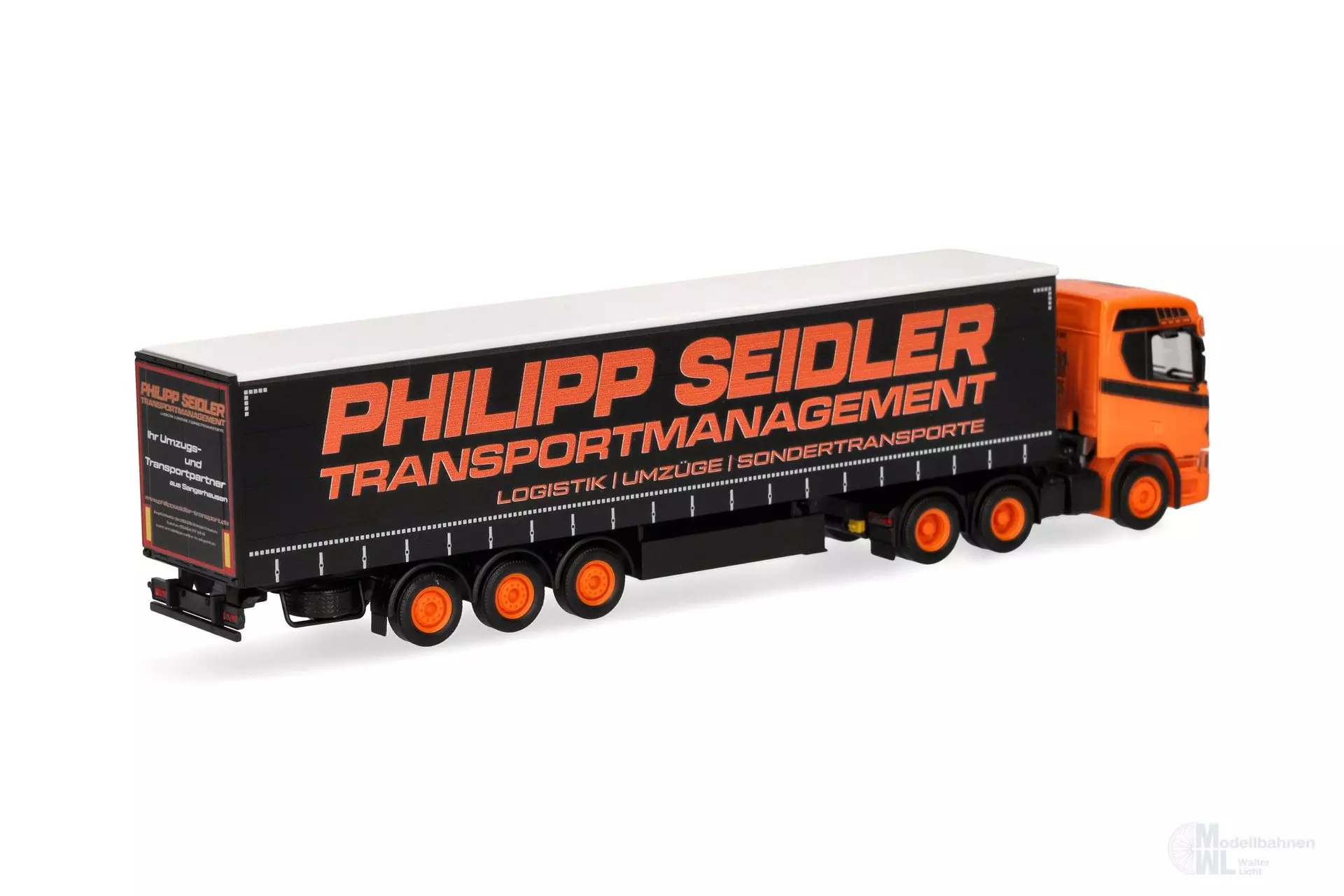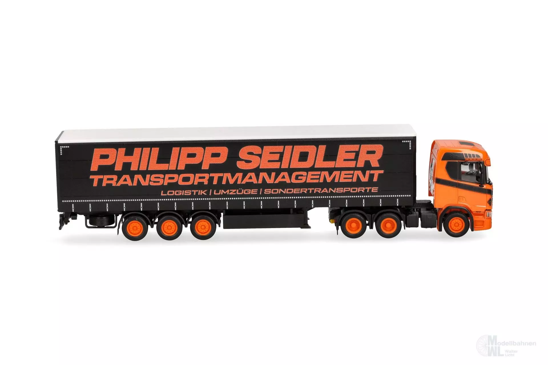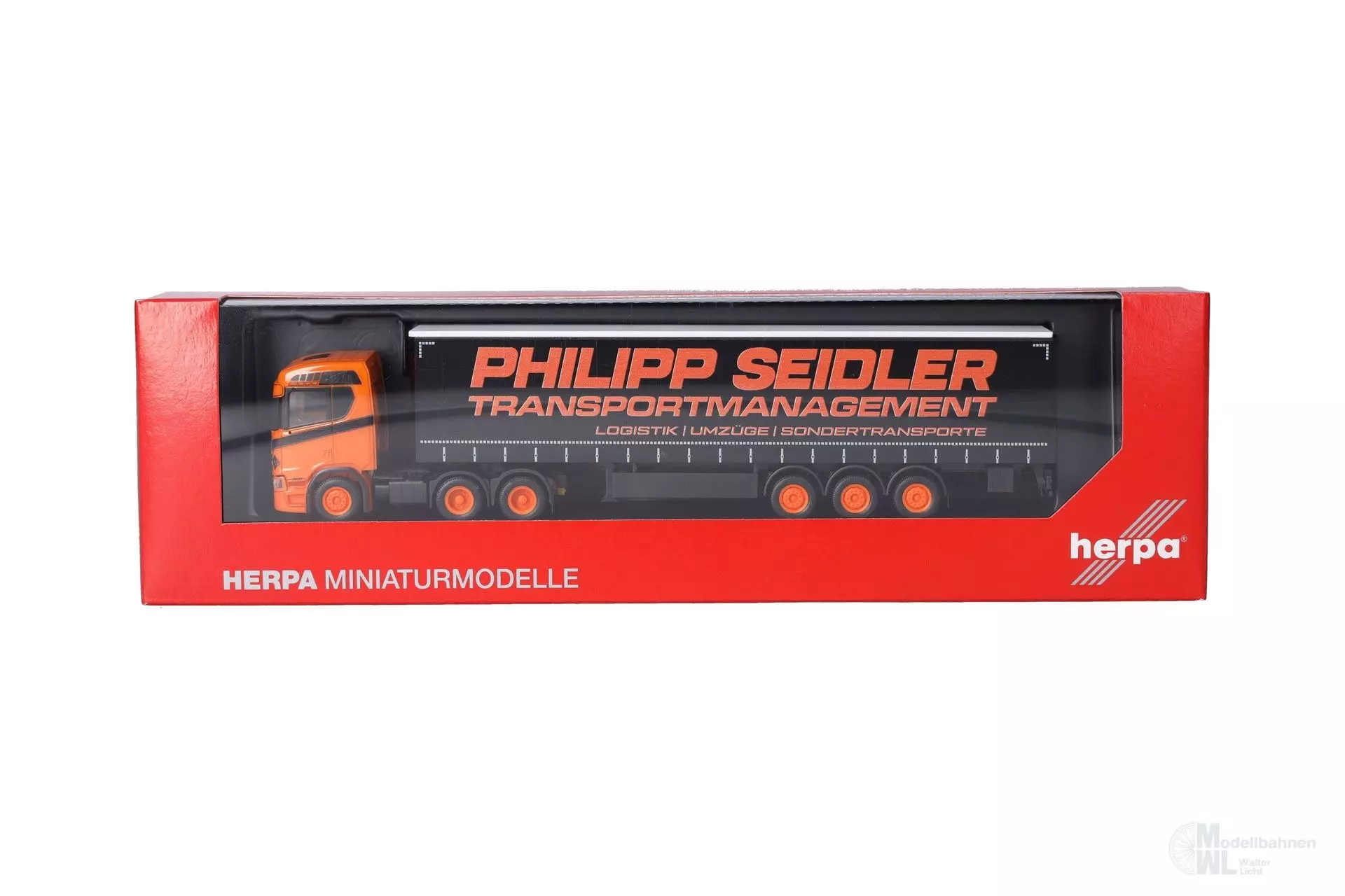 Philipp Seidler aus Sangershausen in Sachsen-Anhalt stellte bereits vor Jahren das Vorbild für eine Herpa Miniatur. Dieser auffällige und dreiachsige Scania ist in den für das Unternehmen typischen Farbgebung schwarz und orange gehalten und wird von Herpa in einmaliger Auflage produziert.
