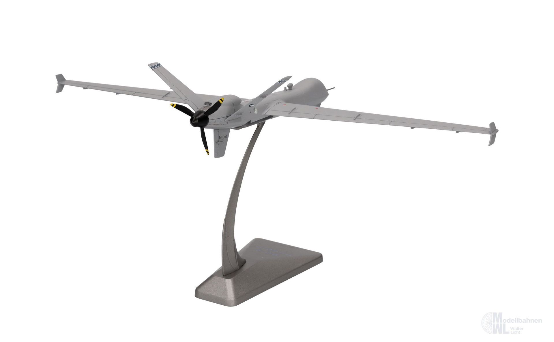 Die MQ-9 Reaper ist ein ferngesteuertes, unbemanntes Luftfahrzeug. Sie wird von einer zweiköpfigen Crew von einer Bodenstation aus geflogen. Mit ihrem Turboprop-Triebwerk mit einer Leistung von 900 PS erreicht die MQ-9 eine Höchstgeschwindigkeit von 480 km/h, während die 1.800 kg Treibstoff ihr eine Reichweite von 1.900 km ermöglichen. Seit Februar 2022 fliegt die 306. Staffel ab Leeuwarden die derzeit vier an die niederländischen Luftwaffe gelieferten MQ-9. Vier weitere Exemplare sind inzwischen bestellt. Zum Schutz der NATO-Ostgrenze wurden 2024 drei Drohnen nach Rumänien verlegt. Die unbewaffneten MQ-9 verstärken dort die Grenzüberwachung und unterstützen die Aufklärung über Rumänien und dem Schwarzen Meer. Während das Kommando aus 130 Soldatinnen und Soldaten besteht, bleiben die Piloten selbst in Leeuwarden. Dieses Metallmodell im Maßstab 1:72 kann wahlweise mit ausgefahrenem Fahrwerk oder mit eingezogenem Fahrwerk ausgestellt werden. Zwei Sätze von Fahrwerkselementen sowie ein Displaystand sind im Lieferumfang enthalten.