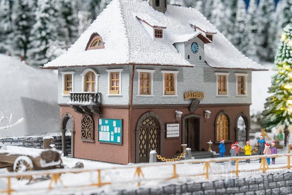 O Tannenbaum, o Tannenbaum – festlich erklingt der Gesang durch die Miniaturwelt. Vor dem funkelnd erleuchteten Weihnachtsbaum versammelt sich der kleine Chor, um gemeinsam vor dem Rathaus stimmungsvolle Weihnachtslieder zu singen. Das Rathaus selbst präsentiert sich in rustikalem Charme: eine Kombination aus Blau und Braun, mit dunklen Ziegeln gedeckt und einem verträumten Türmchen auf dem Dach.