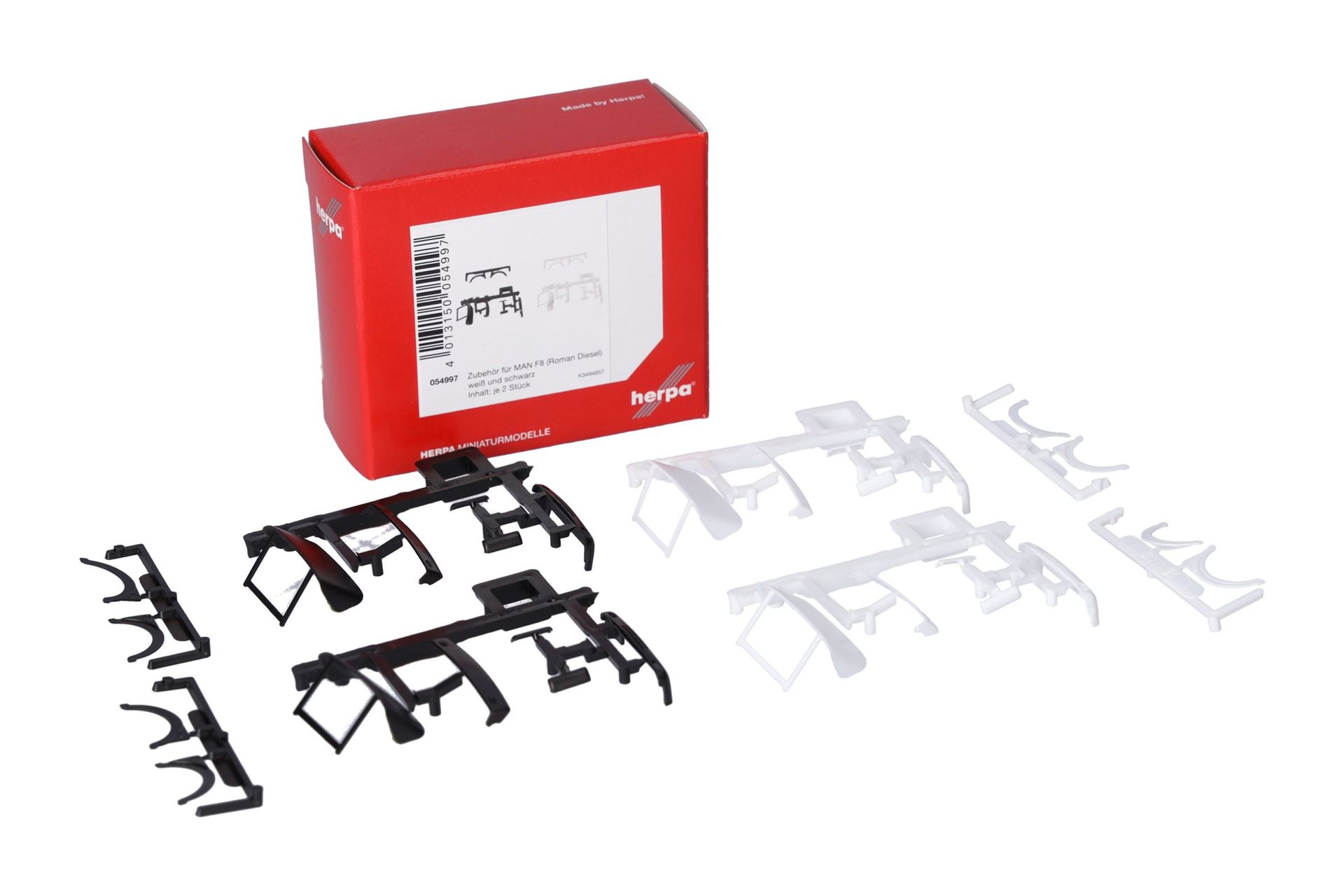 Auch für den klassischen MAN F8 aus dem Herpa-Programm wird das passende Zubehör wie Dachspoiler, Stoßstange, Windleitecken und Kotflügeleinsätze mit jeweils 2 Set in weiß und schwarz zum Nachrüsten angeboten.