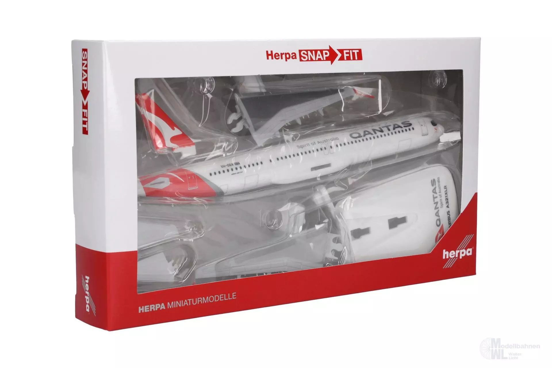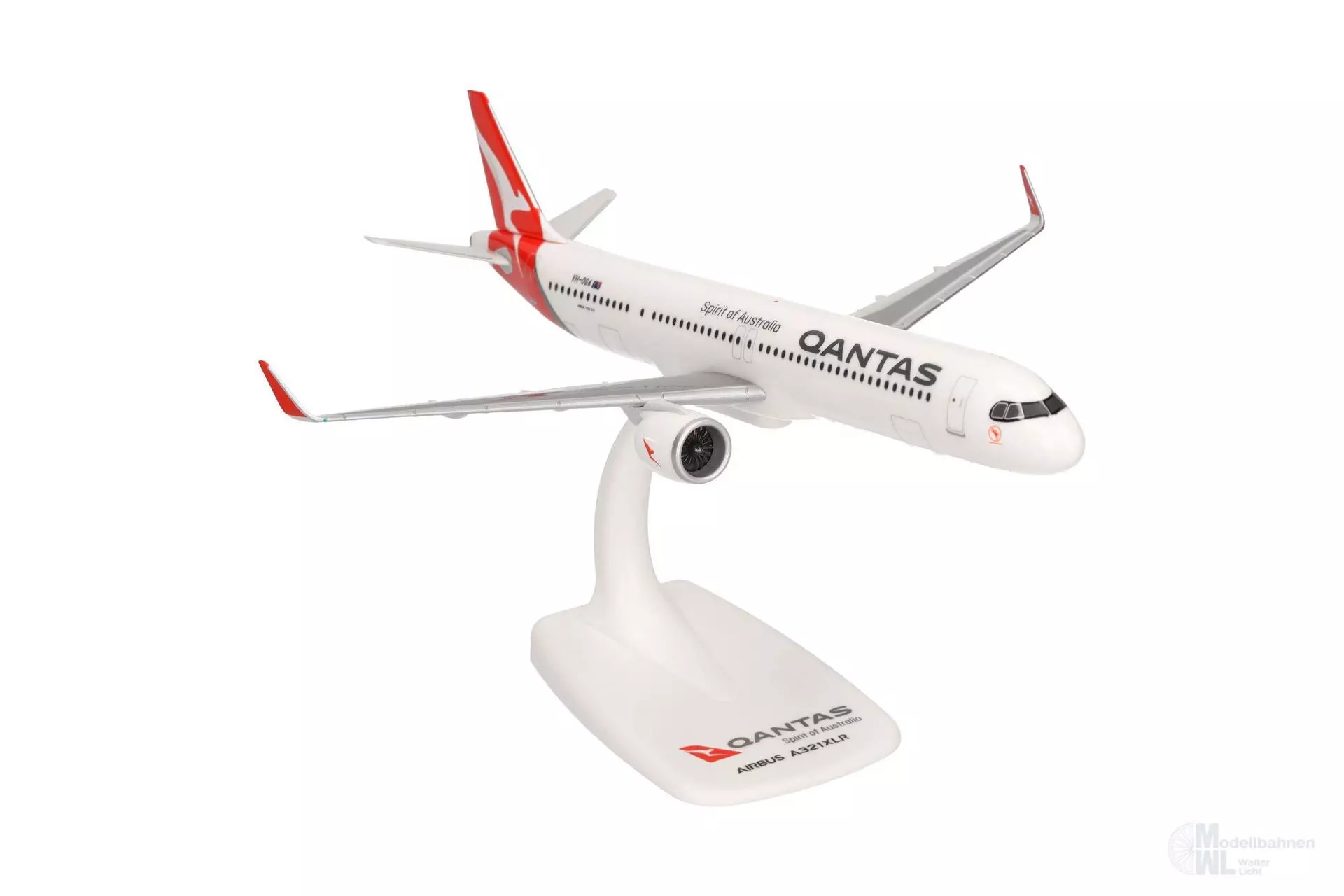 Australiens nationale Fluggesellschaft ist die erste im asiatisch-pazifischen Raum, die den brandneuen Langstrecken-Airbus A321XLR einsetzt. Das neue Flugzeug wird die Boeing 737-Flotte von Qantas im Laufe des nächsten Jahrzehnts schrittweise ersetzen. Aufgrund ihrer Treibstoffeffizienz und zusätzlicher Treibstofftanks kann die A321XLR rund 3.000 km weiter fliegen als die 737, was mehr Nonstop-Flüge über den australischen Kontinent und auch darüber hinaus ermöglicht. Neue internationale Strecken, die aufgrund der bisher benötigten größeren Flugzeuge nicht wirtschaftlich zu betreiben waren, werden geprüft, darunter Verbindungen zwischen Perth an der Westküste und Indien oder Malaysia. SnapFit-Modelle von Herpa überzeugen mit einem unschlagbaren Preis-/Leistungsverhältnis. Sie werden mit einem Display-Stand geliefert und sind mit wenigen Handgriffen ohne Kleber oder sonstigen Werkzeugen zusammengebaut.