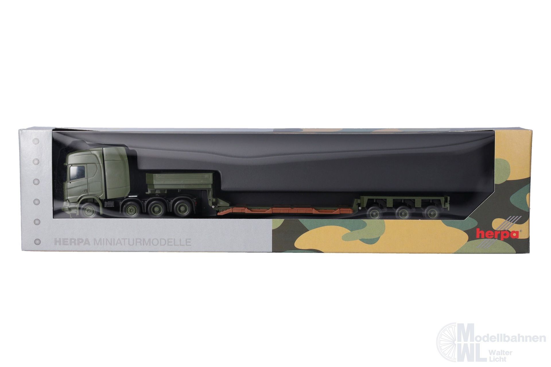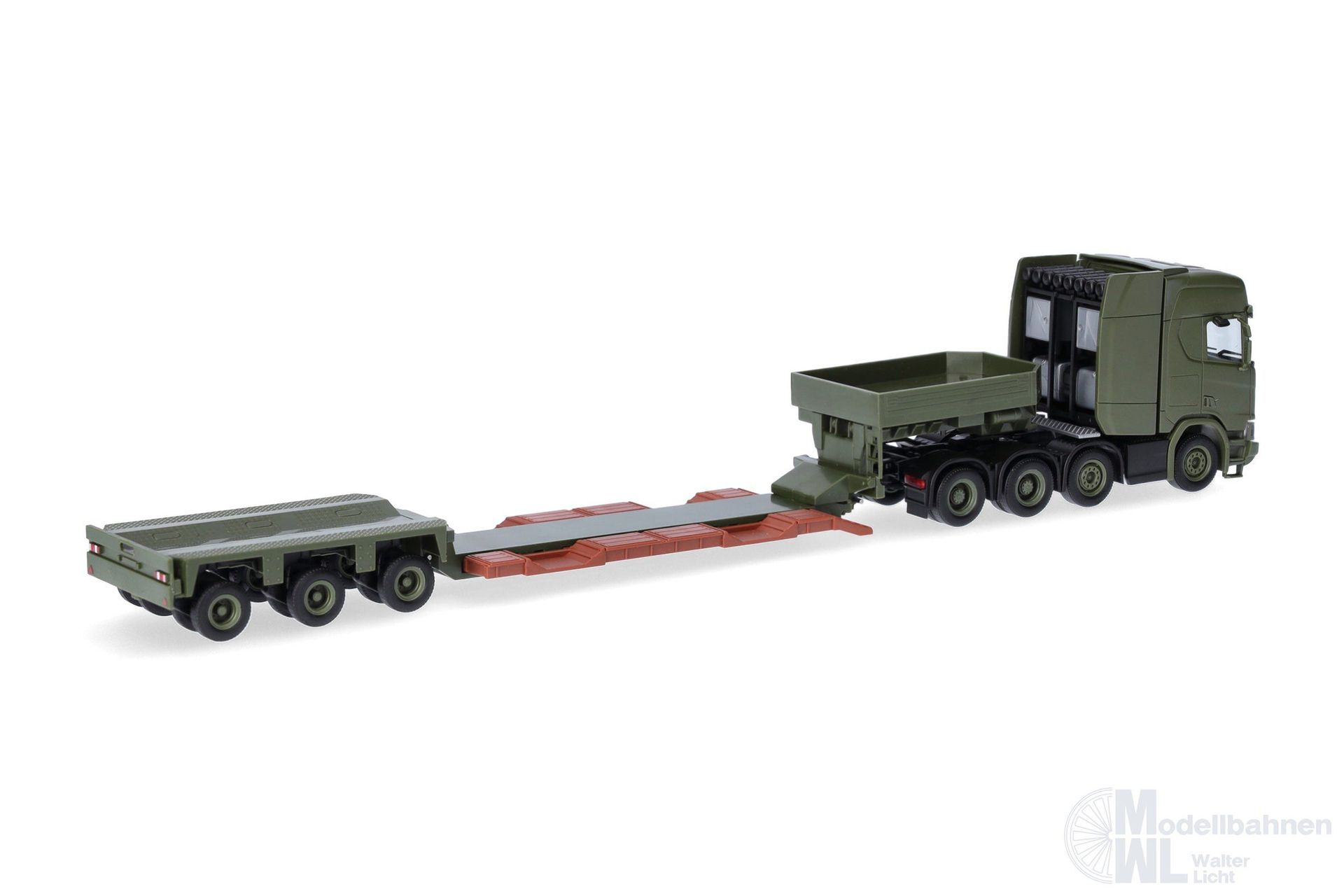 Nach Vorbild eines Fahrzeugs der Dänischen Armee fertigt Herpa diesen Scania CR 20 Hochdach mit einem Tieflade-Auflieger in einer einmaligen Auflage