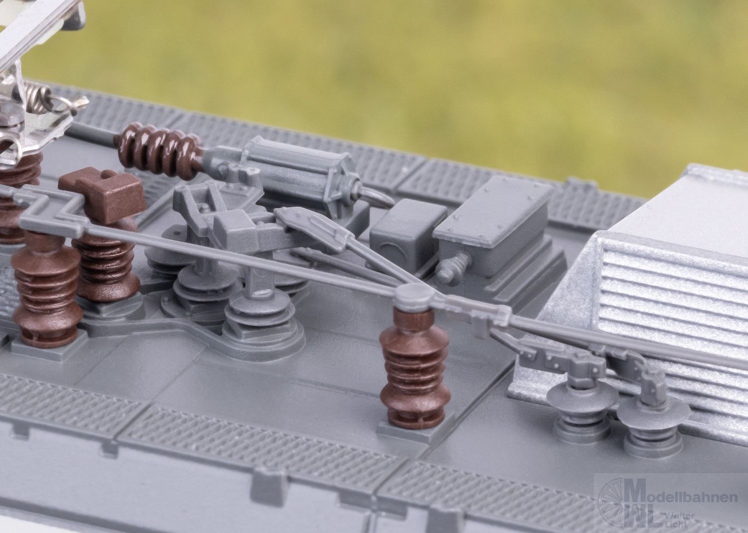 Modell: Mit Digital-Decoder mfx und umfangreichen Geräuschfunktionen. Geregelter Hochleistungsantrieb mit Schwungmasse zentral eingebaut. Alle vier Achsen über Kardan angetrieben. Haftreifen. Fahrtrichtungsabhängig wechselndes Dreilicht-Spitzensignal und zwei rote Schlusslichter konventionell in Betrieb, digital schaltbar. Spitzensignal an Lokseite 2 und 1 jeweils digital separat abschaltbar. Doppel-A-Licht-Funktion. Führerstandsbeleuchtung digital schaltbar. Beleuchtung mit wartungsfreien warmweißen und roten Leuchtdioden (LED). Mit Pufferspeicher. Viele separat angesetzte Teile wie Scheibenwischer, Lüftergitter, Griffstangen und Dachleitungen. Detailliert ausgeführte Dachaufbauten mit neu konstruierten Stromabnehmern mit unterschiedlichen Schleifstücken. Pufferhöhe nach NEM. Bremsleitungen, Schraubenkupplungen und unterschiedliche Steckdosen liegen als separat ansteckbare Teile bei.
