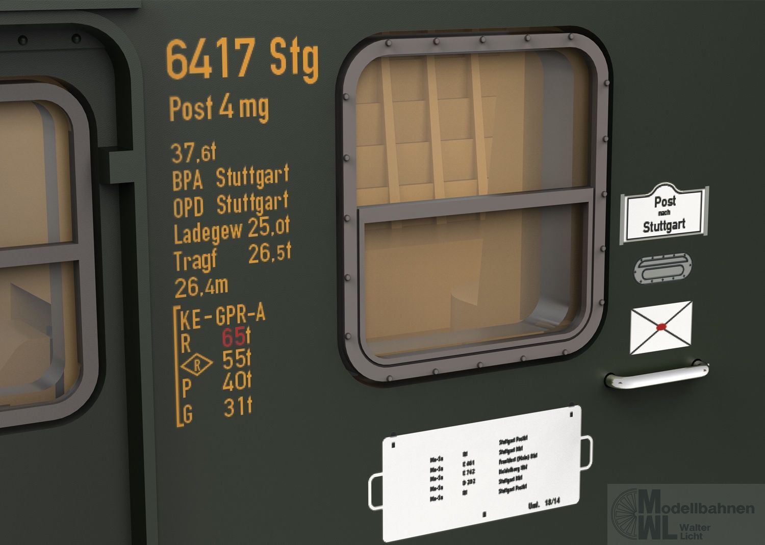 Vorbild: Postwagen der Bauart Post 4mg-bI/26, in der Ausführung der Deutschen Bundespost (DBP) mit dem Wagenlauf Stuttgart-Frankfurt-Heidelberg-Stuttgart.Betriebszustand im Jahr 1963.