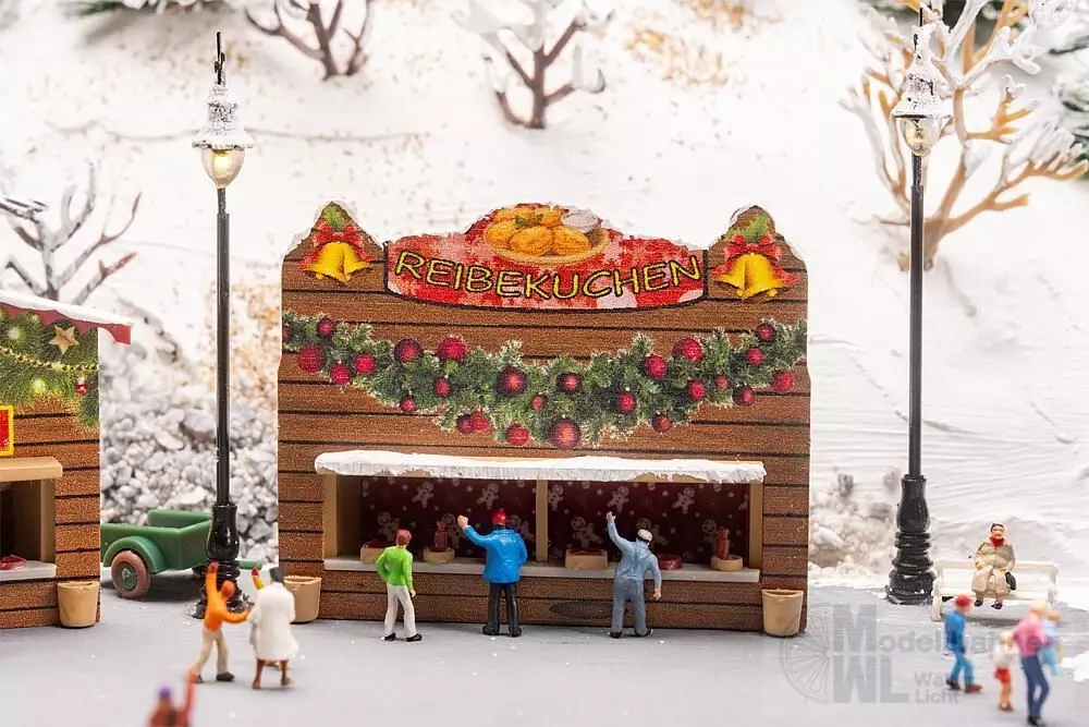 Zwei liebevoll gestaltete Miniatur-Holzbuden stehen einladend auf dem Weihnachtsmarkt. Aus der einen weht der verlockende Duft von Reibekuchen und aus der anderen strömt das süße Aroma von gerösteten Mandeln und heißen Maronen. Zwischen Lichterglanz und Schneeflocken kommt sofort Vorfreude auf – man möchte fast selbst am Stand stehen und genüsslich einen Reibekuchen vernaschen.