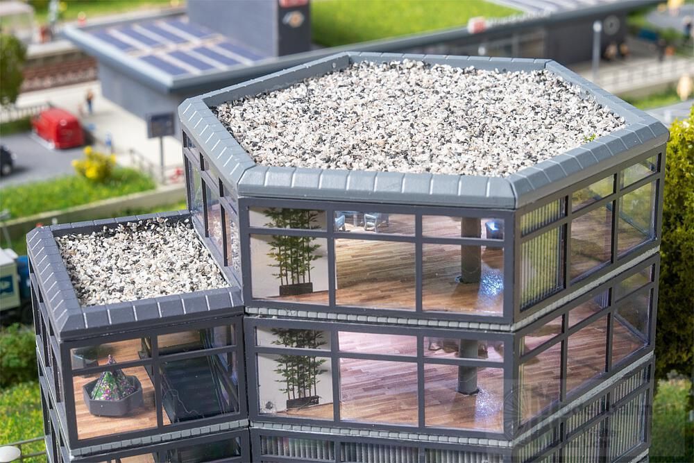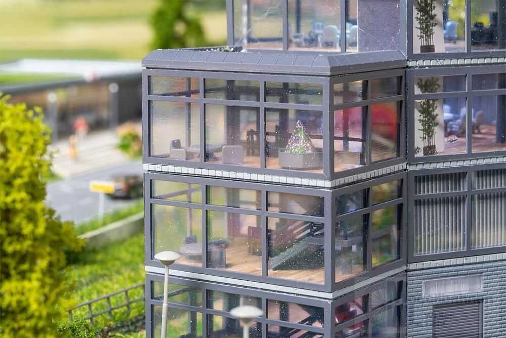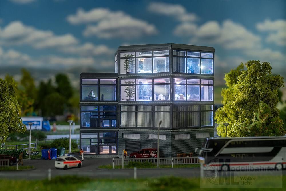 Moderner Bürokomplex mit Charakter! Dieser vierstöckige Bürobau überzeugt mit seiner futuristischen sechseckigen Grundform. Komplett verglast und mit einem dreistöckigen Treppenhaus ergänzt, wirkt die Architektur offen und leicht. Das unterste Stockwerk aus grauen Ziegelsteinen setzt mit seiner Maueroptik einen markanten Kontrast. Perfekt geeignet für jede moderne Stadtlandschaft im Modell.