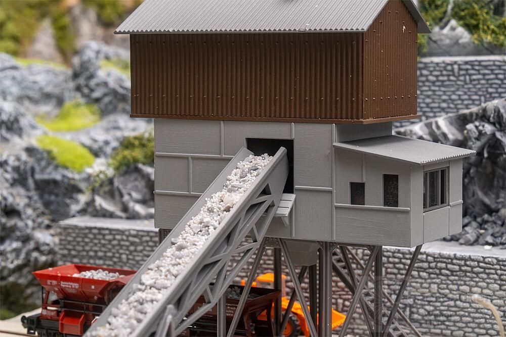 Im Betonmischwerk herrscht Hochbetrieb! Eine beeindruckende Mischanlage mit 3 Hochsiloreihen und einem Bürogebäude bildet das Zentrum. Eine Durchfahrt bietet den LKW die Möglichkeit, schnell beladen zu werden. Die Sandbunkertaschen sind für unterschiedliches Sand- und Kiesgut unterteilt und Sand in 3 verschiedenen Farben zur Ausgestaltung der Sandbuchten ist ebenfalls enthalten. Eine Kranvorrichtung und ein Kies-Verladesilo mit Förderband (ohne Funktion) liegen ebenfalls bei und ergänzen die Szenerie.