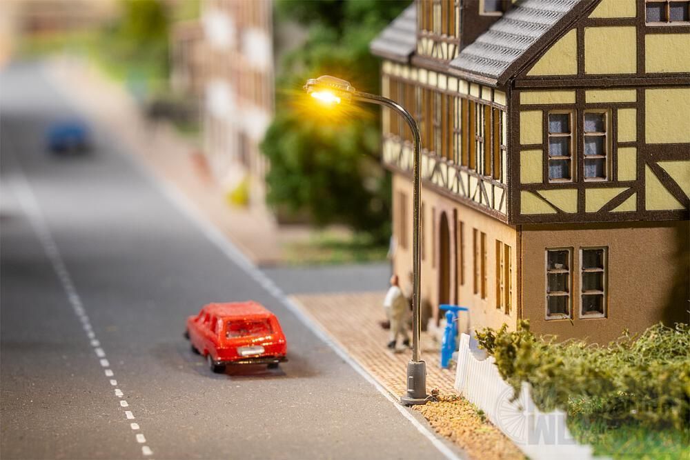 Moderne und weitverbreitete Peitschenleuchte. Besonders geeignet zur Ausgestaltung von Stadt-, Straßen- und Industrieszenerien. Die filigrane Leuchte ist mit langlebiger LED-Technik ausgestattet. Höhe: 30 mm. Lichtfarbe: warmweiß. Das Produkt ist anschlussfertig für: 12 V DC. Nutzen Sie für den Betrieb der Leuchte den Transformator, Art. 180641.