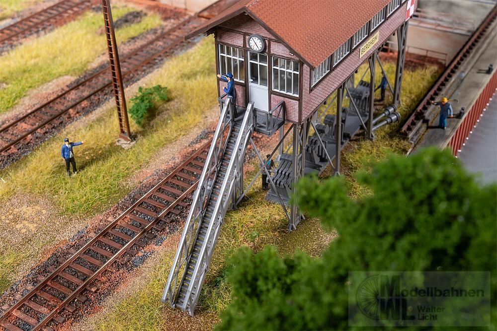 Steuerzentrale im Miniaturformat – über dieses Stellwerk werden in der Realität Weichen gestellt, Signale geschaltet und der Verkehr zum Leben erweckt. Das Modell orientiert sich an einem französischen Vorbild und besticht durch seine schlanke Konstruktion auf filigranen Stützen. Die erhöhte Bauweise erlaubt eine Platzierung zwischen den Gleisen. Eine detailreiche Inneneinrichtung liegt bei und ergänzt das Modell.