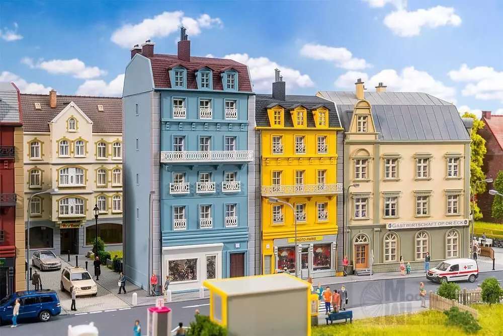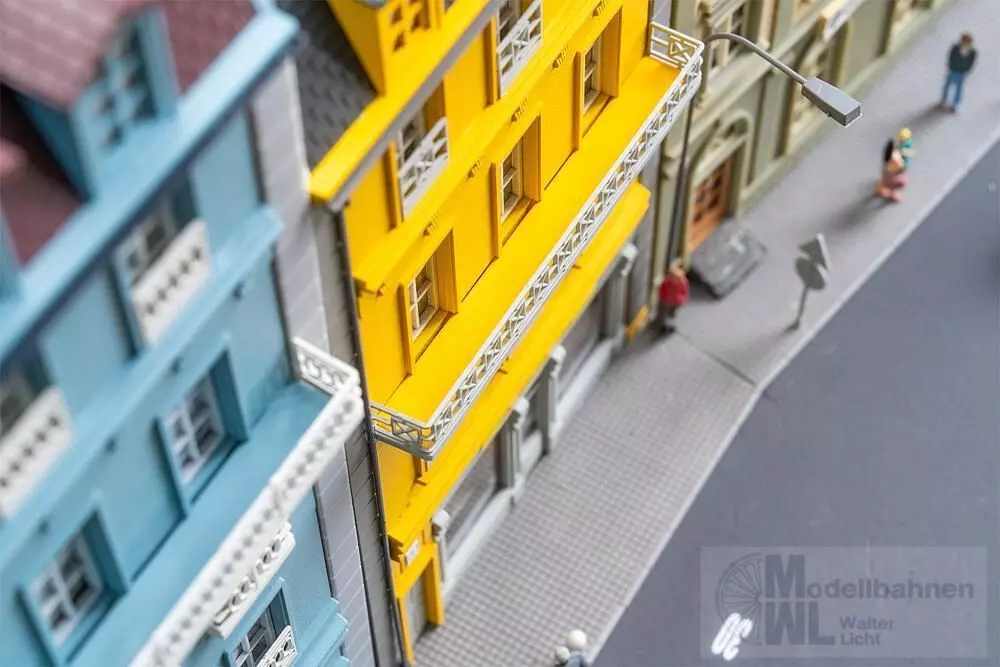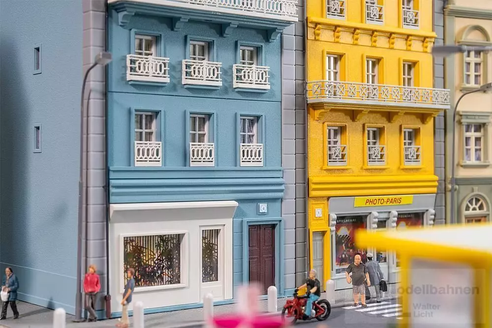 Farbtupfer fürs Stadtbild – mit ihren bunten Farben bringen diese beiden Stadthäuser frischen Wind in Ihre Miniaturstadt: Das gelbe Haus mit vier Stockwerken und das blaue Pendant mit fünf Etagen ergänzen sich perfekt und setzen farbenfrohe Akzente im Stadtviertel. Die klassischen Mansardendächer verleihen den Modellen einen Hauch historischer Eleganz – ideal kombiniert mit den Stadthäusern Art. 130712 und Art. 130713.