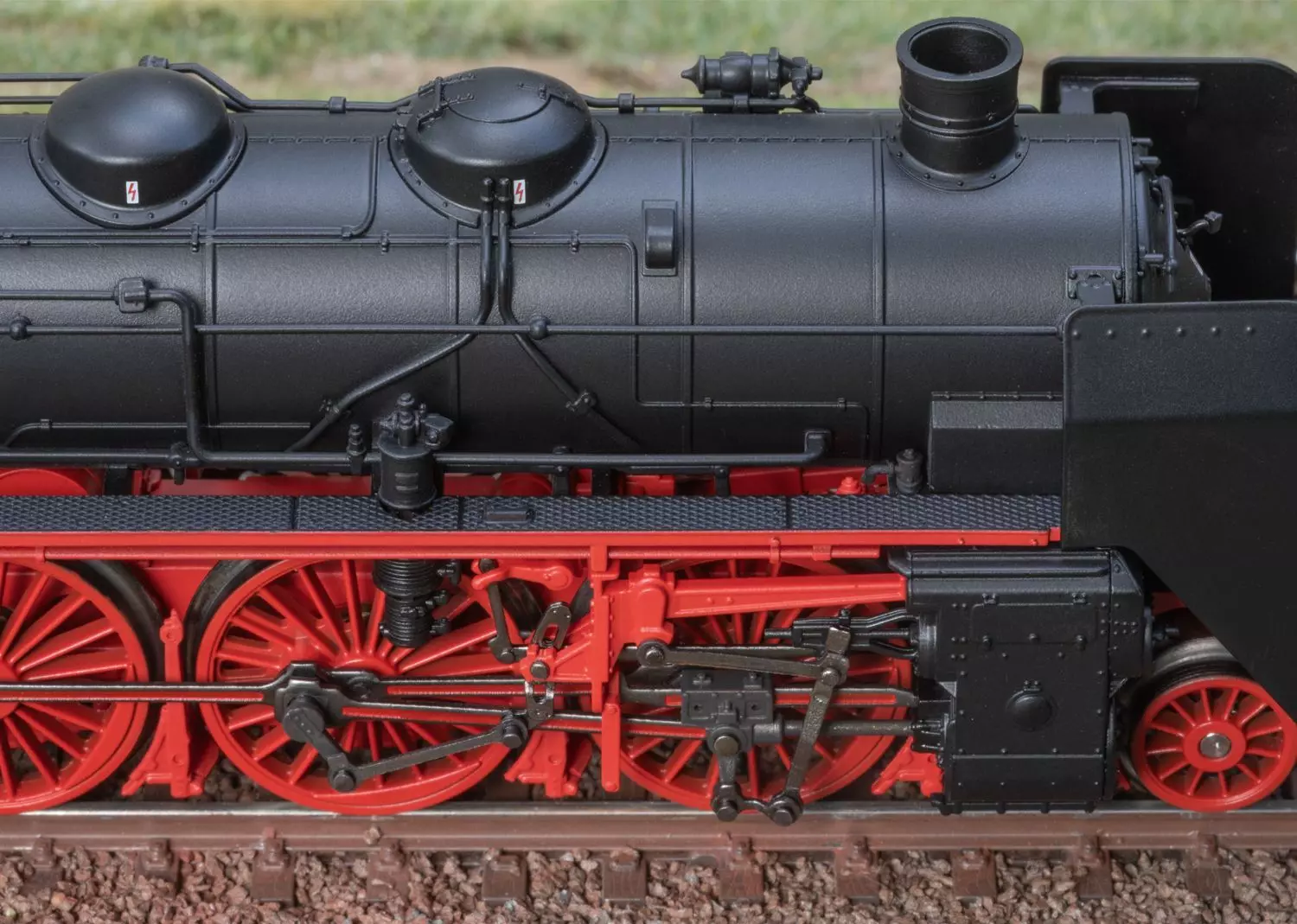 Modell: Mit Digital-Decoder und umfangreichen Geräuschfunktionen. Geregelter Hochleistungsantrieb mit Schwungmasse im Kessel. 4 Achsen angetrieben. Haftreifen. Lokomotive und Tender weitgehend aus Metall. Serienmäßig eingebauter Raucheinsatz, mit geschwindigkeitsabhängigem, dynamischem Rauchausstoß. Fahrtrichtungsabhängig wechselndes Zweilicht-Spitzensignal konventionell in Betrieb, digital schaltbar. Führerstandbeleuchtung und Feuerbüchsenflackern jeweils separat digital schaltbar. Beleuchtung mit wartungsfreien warmweißen und roten Leuchtdioden (LED). Mit Pufferspeicher. Schwenkbare Führerstandtüren und Imitation der Vorhänge zwischen Führerstand und Tender. Kurzkupplung mit Kinematik zwischen Lok und Tender. Am Tender kinematikgeführte Kurzkupplung mit NEM-Schacht. Pufferhöhe an Lok und Tender nach NEM. Befahrbarer Mindestradius R2 437,5 mm. Kolbenstangenschutzrohre und Bremsschläuche liegen bei. Länge über Puffer 26,0 cm.
