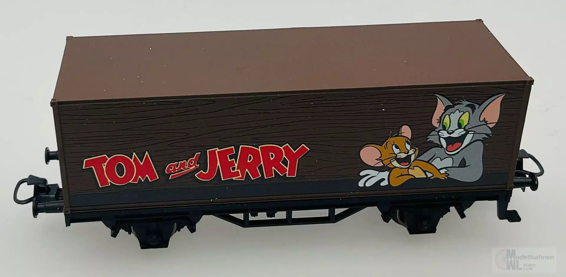 Modell: Containerwagen in toller Gestaltung zum Thema "Tom & Jerry". Wagen mit zwei Löchern in einer Seitenwand, welche passend zur Gestaltung "Mäuselöcher" darstellen. Mit RELEX-Kupplungen für schnelles und einfaches Kuppeln. Wagenlänge 12 cm. Gleichstromradsatz E700580 separat erhältlich.