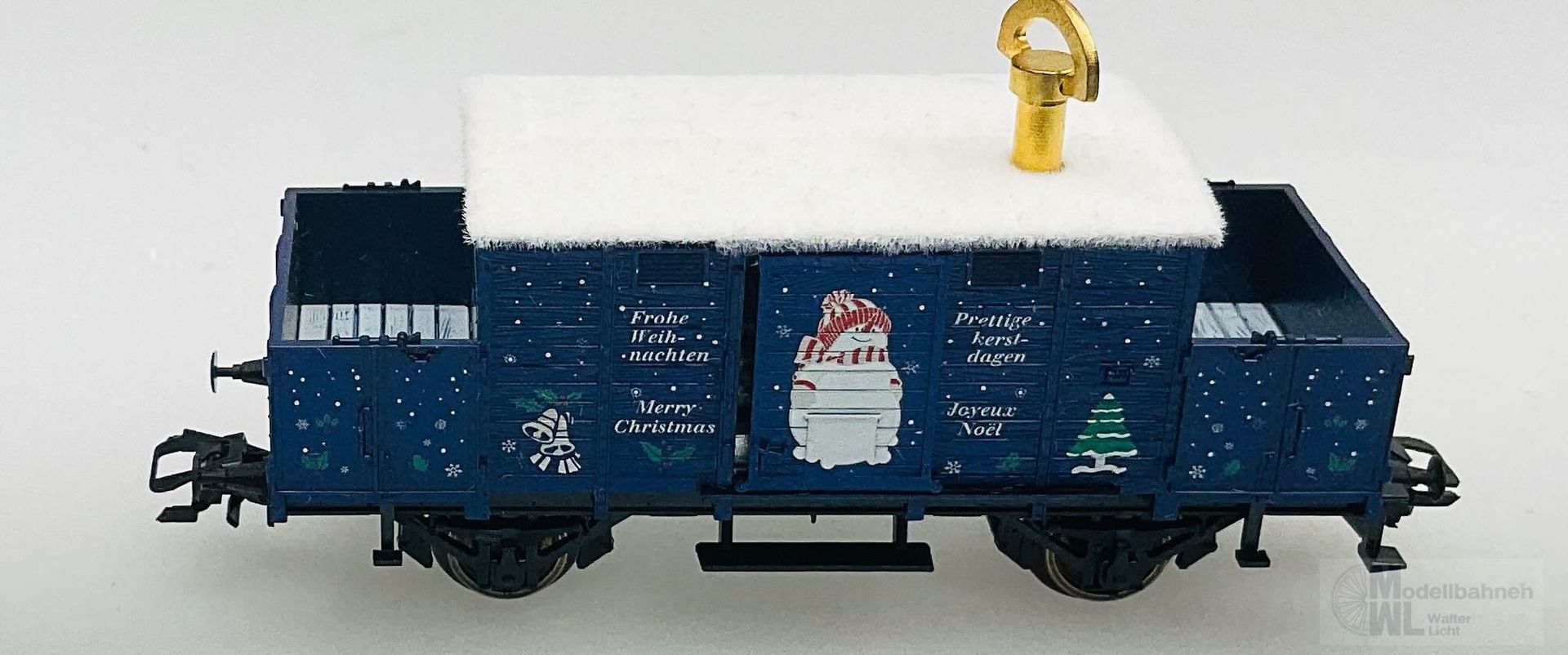 Modell: Gestaltung als Geschenkpaket-Transporter. Detailliertes Fahrgestell. Schiebetüren zum Öffnen. Dach in Schneestruktur beflockt.Eingebaute mechanische Spieluhr mit vom Dach zugänglichem Aufzug. Voll aufgezogen, spielt das Werk mehrmals die Melodie „We Wish You a Merry Christmas“. Kräftiger Klang. Kurzkupplungen mit Kulissenführung. Länge über