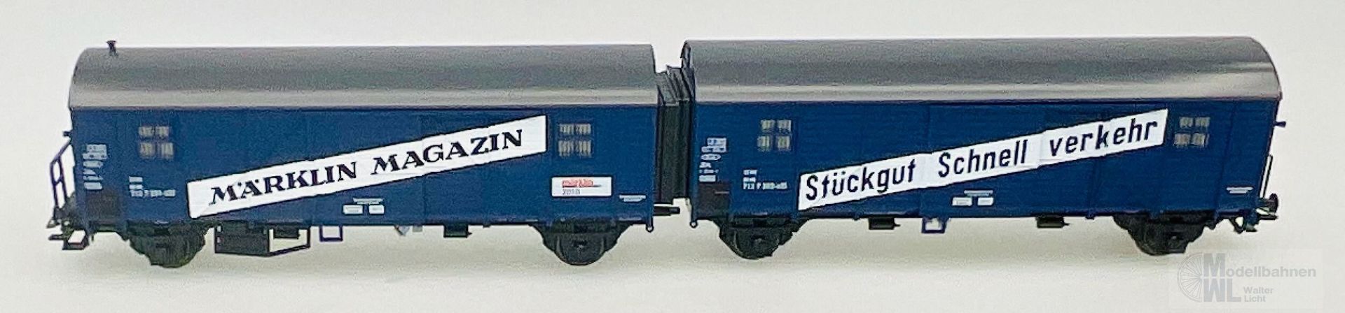 Modell: Beide Wagen fest miteinander gekuppelt und mit Faltenbalg verbunden. Detaillierte Ausführung mit großflächiger Bedruckung "Märklin Magazin" auf der einen und "Stückgut Schnellverkehr" auf der anderen Seite.