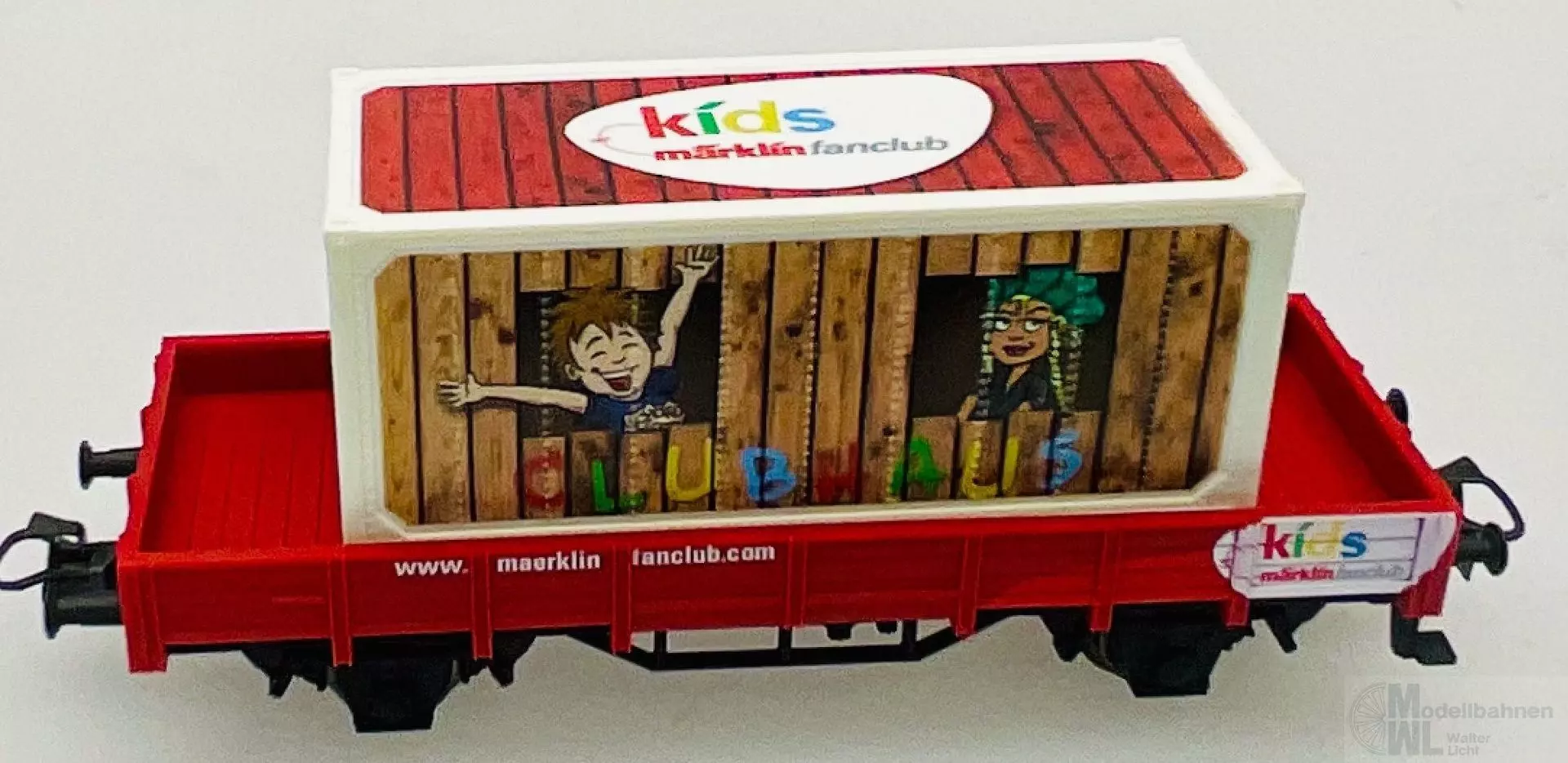 Modell: Wagen in Sonderfarbgebung. Container gestaltet als Märklin Kids Club Clubhaus. Relex-Kupplungen.