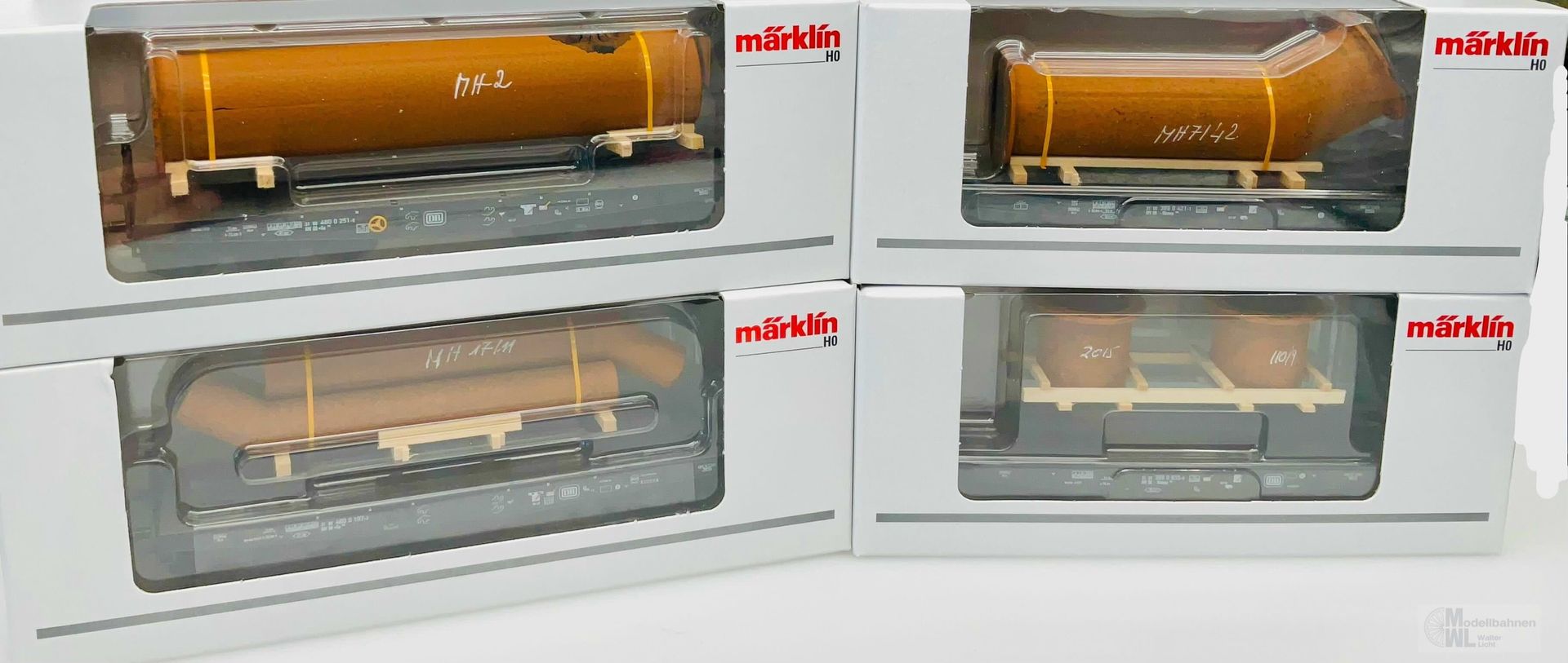 Modell: Aufbauten der Flachwagen aus Metall. Flachwagen jeweils einmal mit geborstenem Rohr, abgewinkeltem 3er-Rohr-Set, Knickflanschrohr und zwei Flanschrohr-Stutzen beladen. Darstellung der Beladung in angerosteter Optik. Unterschiedliche Betriebsnummern. Einsteckbare Rungen liegen jeweils bei. Alle Wagen einzeln verpackt. Länge über Puffer der 6-achsigen Wagen 15,2 cm. Länge über Puffer der 4-achsigen Wagen 12,4 cm. Gleichstromradsatz je Flachwagen E700580.