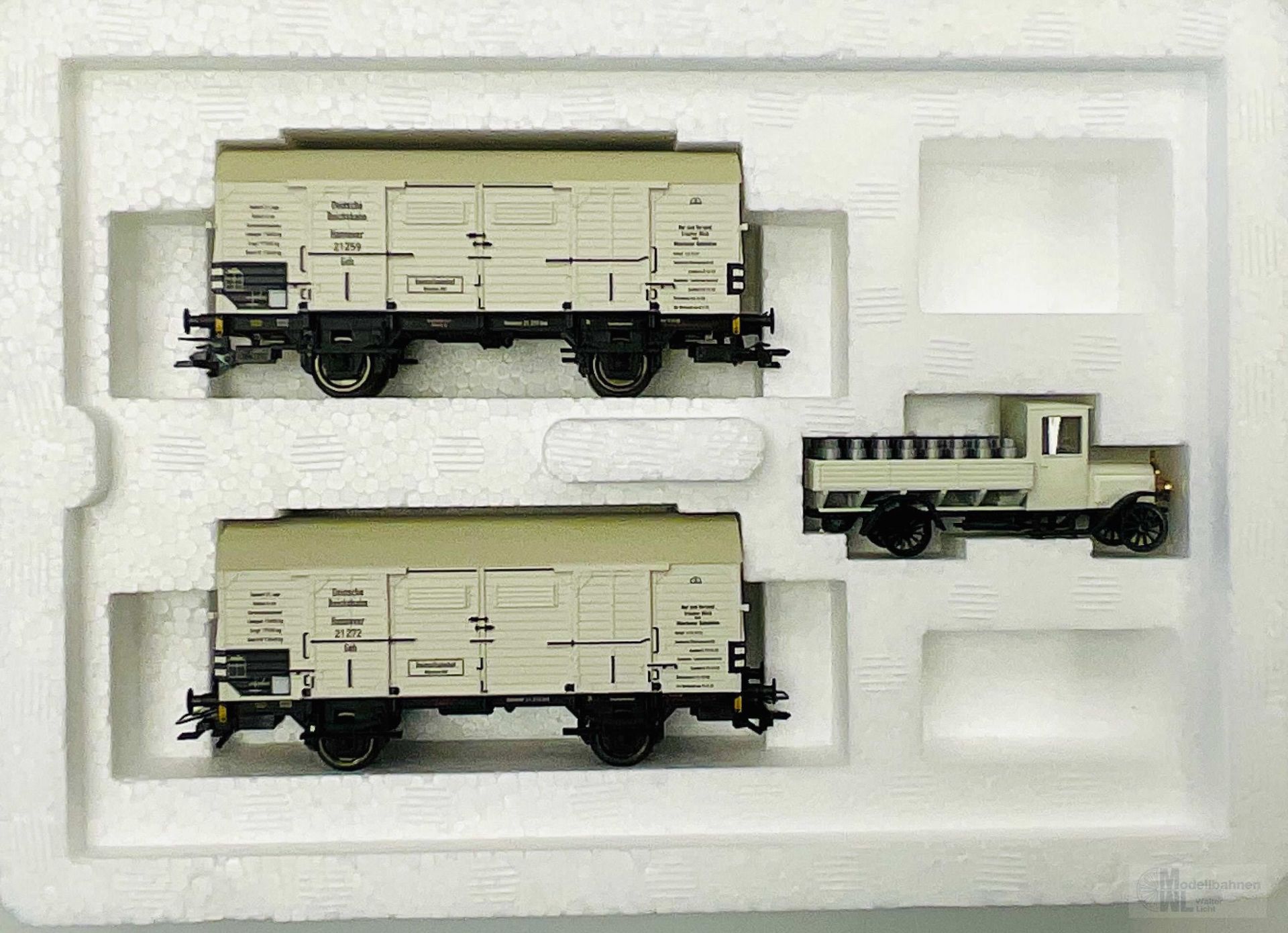 Modell: Gedeckte Güterwagen mit jeweils 2 angesetzten Tritten je Längsseite unterhalb der Schiebetüren. LKW beladen mit Milchkannen. Beide Güterwagen mit unterschiedlichen Betriebsnummern. Gesamtlänge über Puffer 22,2 cm.