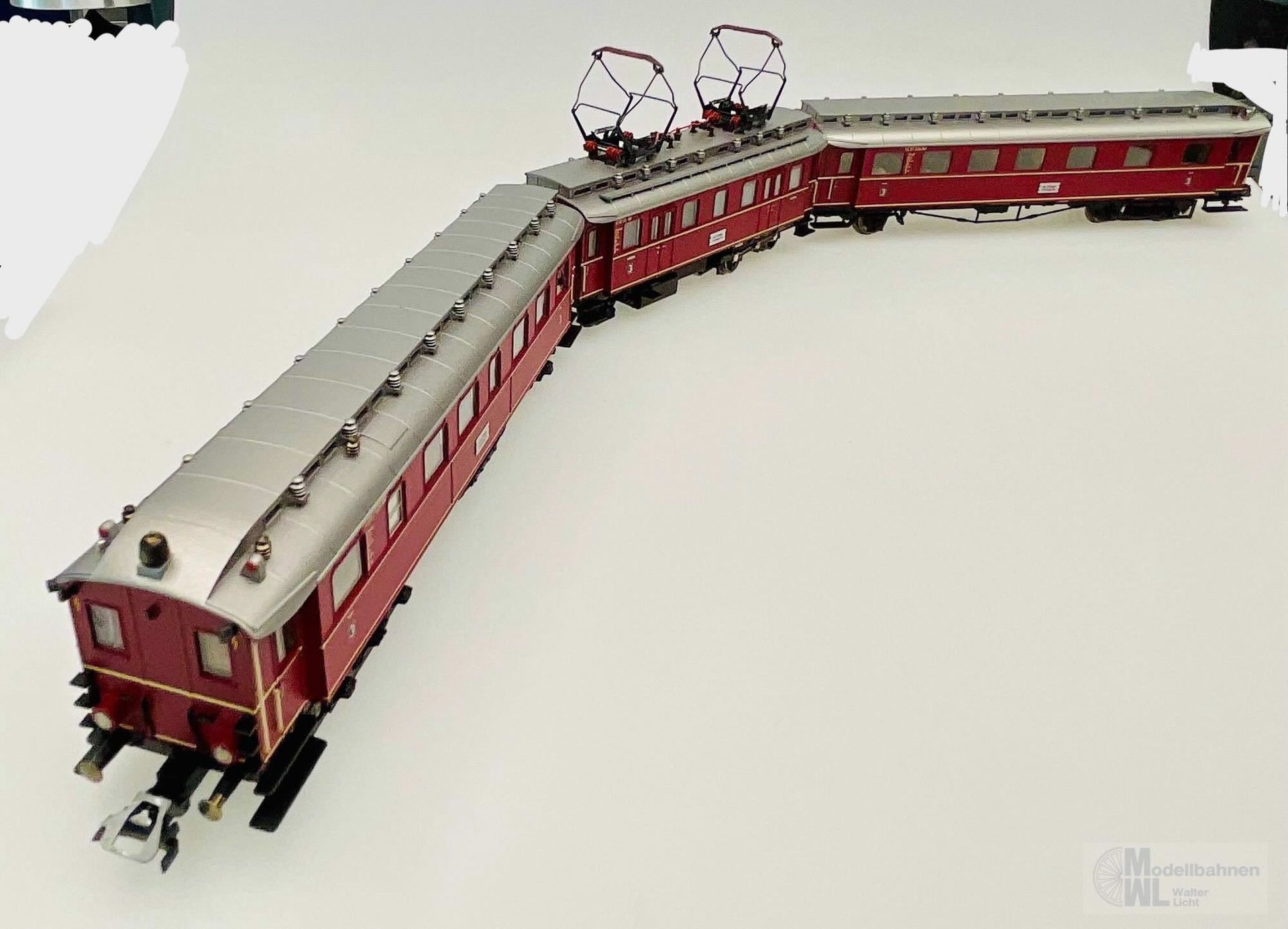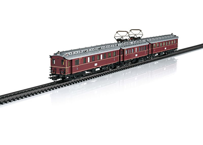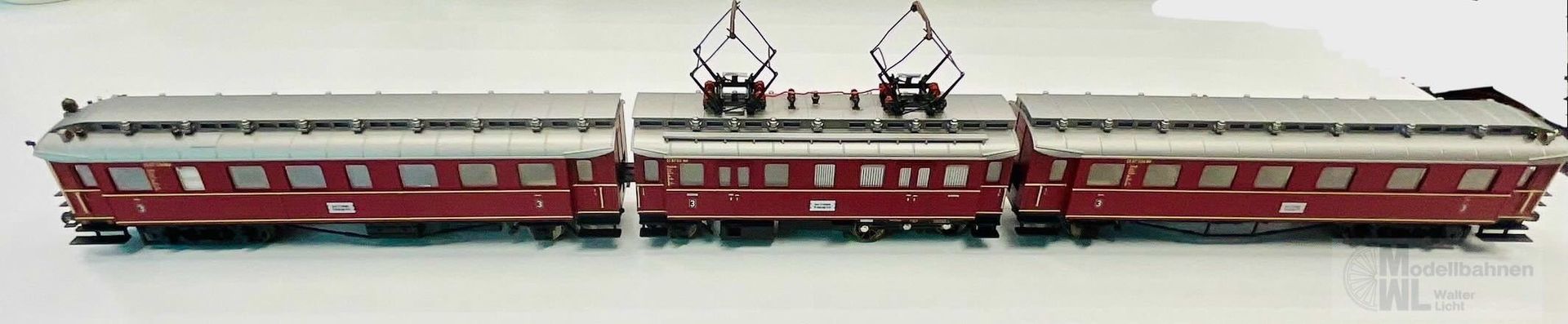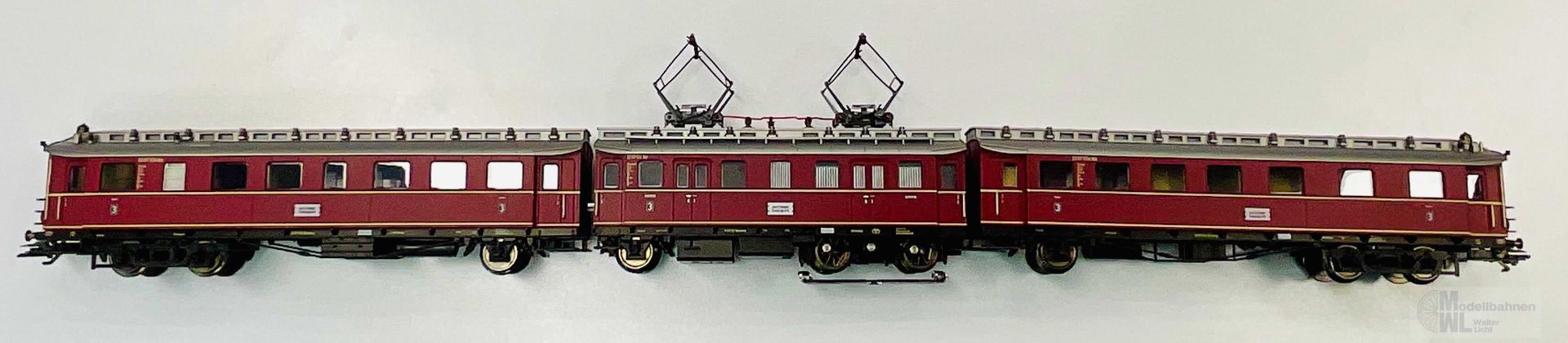 Vorbild: Elektrischer Triebzug (ET) 87 der Deutschen Bundesbahn (DB). Achsfolge 2'1 + B'1 + 1 2'. Bestehend aus Steuerwagen a (ES 87 03 a), Triebwagen (ET 87 03) und Steuerwagen b (ES 87 03 b). Purpurrote Farbgebung. Betriebszustand um 1955.