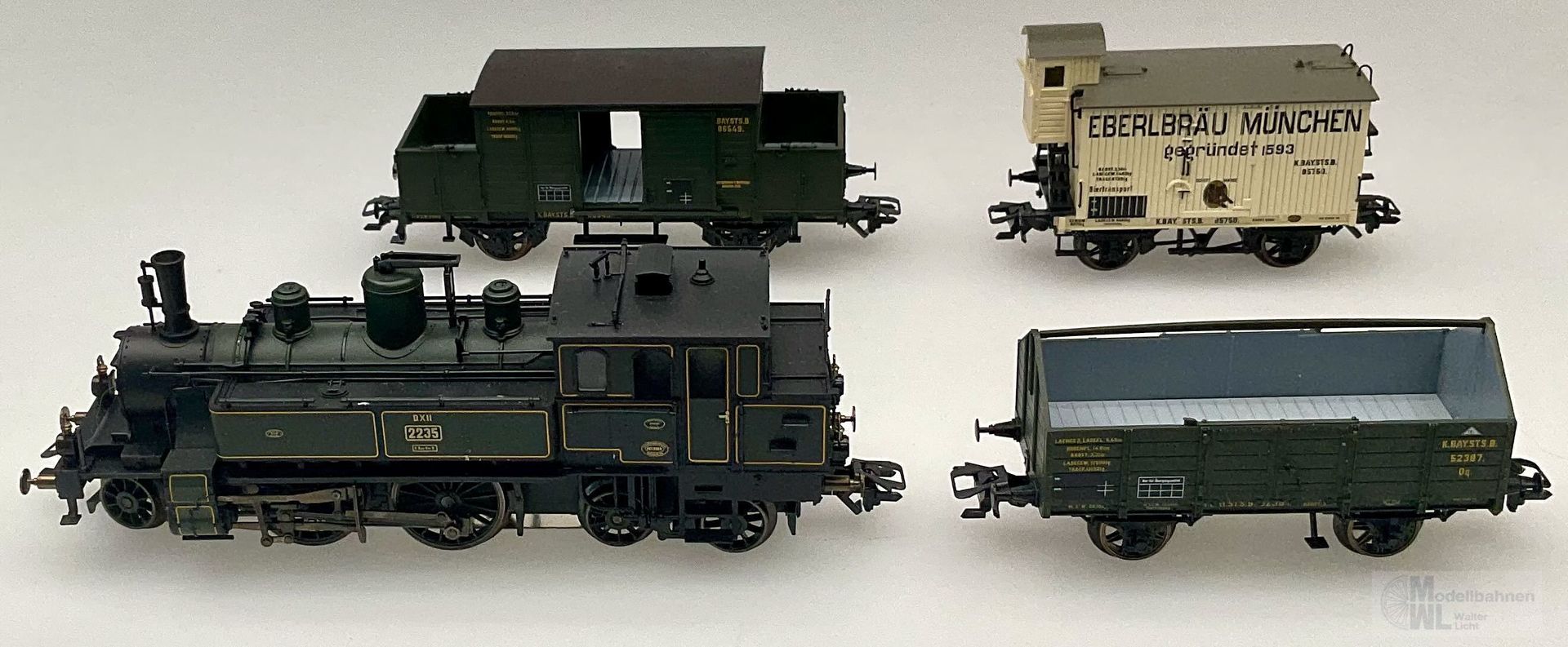 Vorbild: Tenderlokomotive Reihe D XII der Königlich Bayerischen Staatsbahn (K.Bay.Sts.B.), spätere DRG-Baureihe 73. Drei Privat-Güterwagen. 1 offener Güterwagen, 1 Bierwagen der Brauerei Eberl Bräu und ein Kolonialwarenwagen. Alle Wagen eingestellt bei der K.Bay.Sts.B., Zustand um 1908.