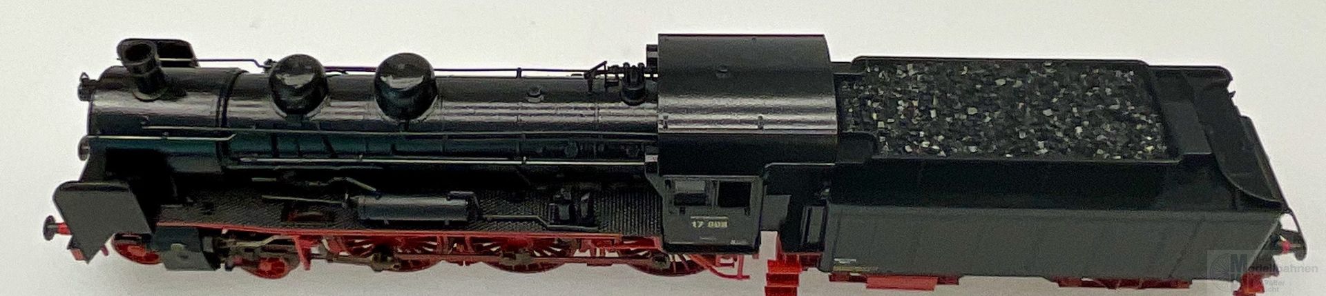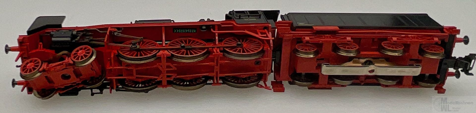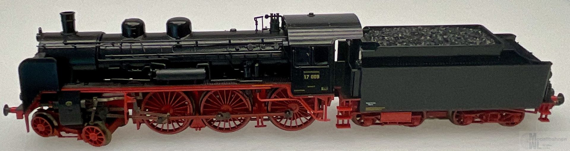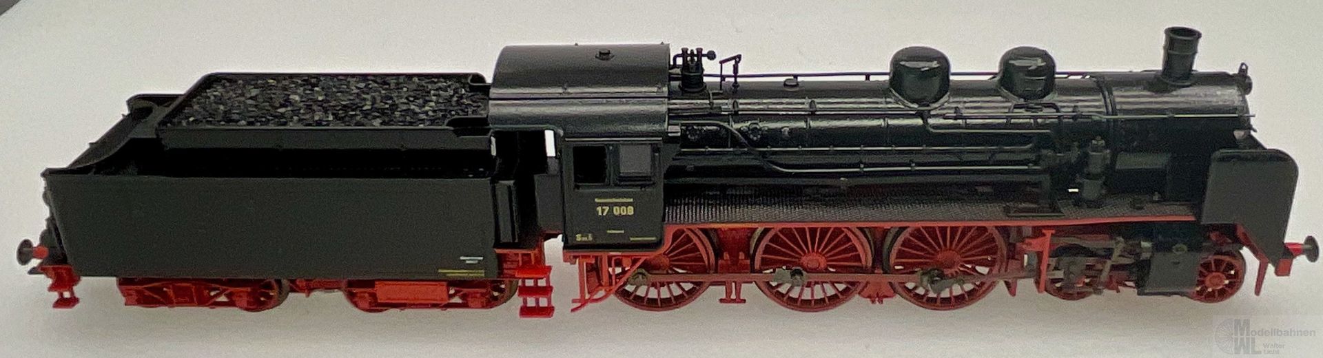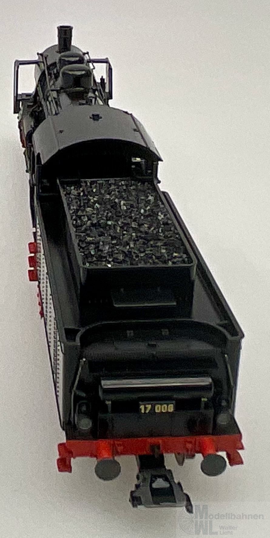 Modell: Mit Digital-Decoder mfx+ und umfangreichen Geräuschfunktionen. Geregelter Hochleistungsantrieb mit Schwungmasse im Kessel. 3 Achsen angetrieben. Haftreifen. Lokomotive und Kohlentender weitgehend aus Metall. Rauchsatz ist eingebaut. Fahrtrichtungsabhängig wechselndes Zweilicht-Spitzensignal und Rauchsatz konventionell in Betrieb, digital schaltbar. Führerstandsbeleuchtung, Feuerbüchsenflackern und Gegenzugsignal zusätzlich jeweils separat digital schaltbar. Beleuchtung mit wartungsfreien warmweißen und roten Leuchtdioden (LED). Kurzkupplung mit Kinematik zwischen Lok und Tender. Hinten am Tender kulissengeführte Kurzkupplung mit NEM-Schacht. Befahrbarer Mindestradius 360 mm. Kolbenstangenschutzrohre liegen bei. Es liegen je ein Lokführer- und Heizerfigur zum nachträglichen Einbau im Führerstand bei.