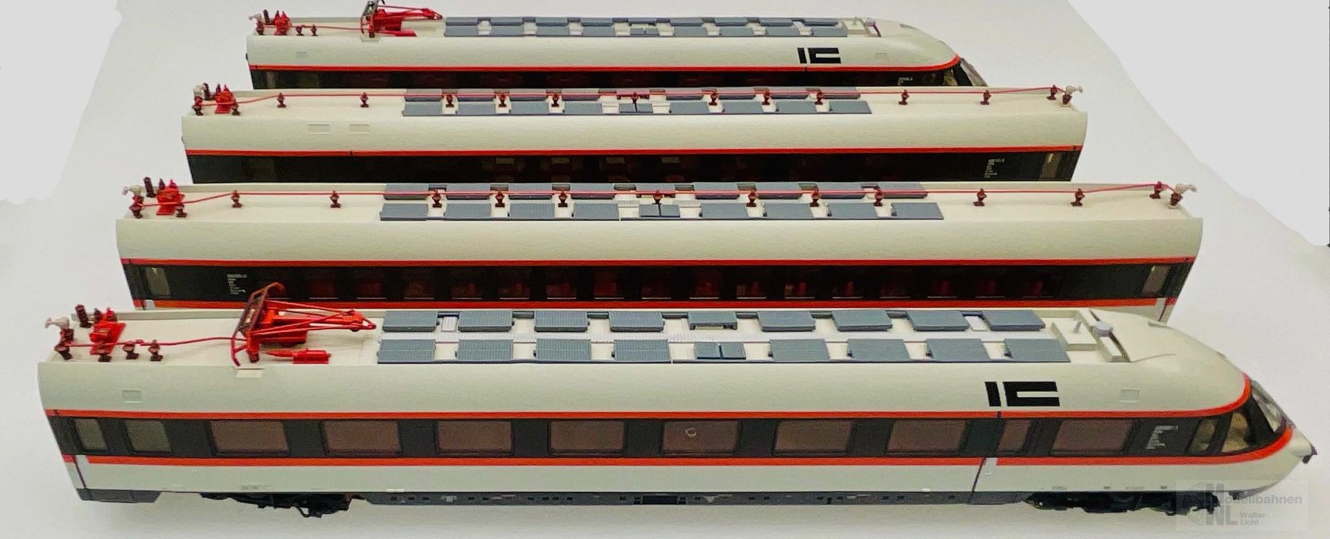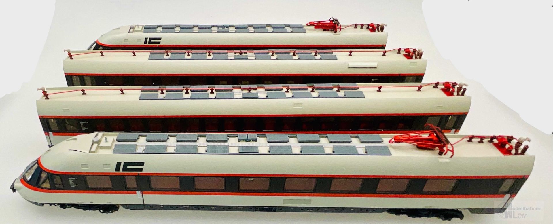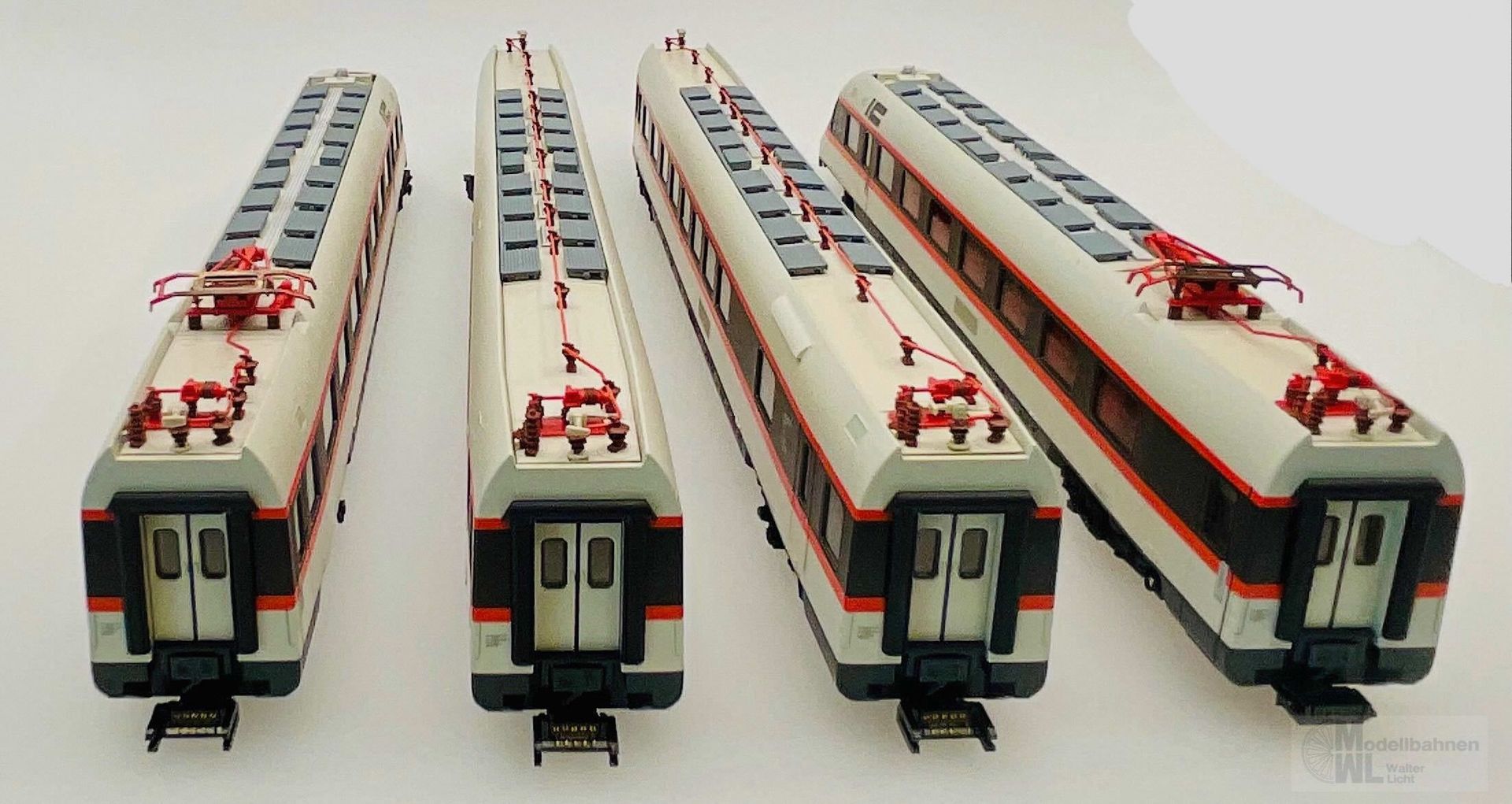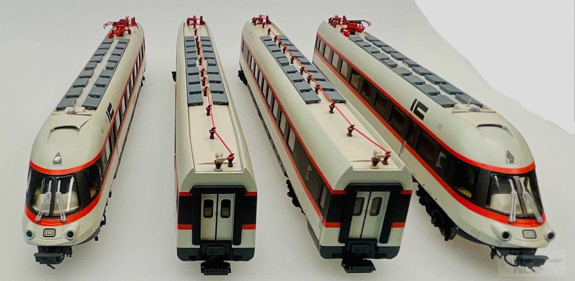 Modell: 4-teilige Einheit. Mit Digital-Decoder mfx und umfangreichen Geräuschfunktionen. 2 geregelte Hochleistungsantriebe mit Schwungmasse im Großraum-Mittelwagen. Jeweils beide Achsen in beiden Drehgestellen über je einen Motor angetrieben. Haftreifen. Serienmäßig eingebaute Innenbeleuchtung, Führerstandsbeleuchtung und beleuchtete Tischlampen. Fahrtrichtungsabhängig wechselndes Dreilicht-Spitzensignal, rote Schlusslichter, Innenbeleuchtung und Führerstandsbeleuchtung konventionell in Betrieb, digital gemeinsam schaltbar. Beleuchtete Tischlampen separat digital schaltbar, wechselnd ein- und ausgeschaltet über Zufallsgenerator. Beleuchtung mit wartungsfreien warmweißen und roten Leuchtdioden (LED). Kulissengeführte mehrpolige Strom führende Spezialkupplung zwischen den Fahrzeugen. Schleiferumschaltung mit fahrtrichtungsabhängiger Stromversorgung über den jeweils vorderen Endtriebwagen. Viele angesetzte Details. Detaillierte Ausführung der Dachausrüstung. Pantographen nur mechanisch, nicht elektrisch funktionsfähig. An beiden Enden Nachbildung der Scharfenberg-Kupplung (ohne Funktion). Gleisbogen befahrbar ab Mindestradius 360 mm.