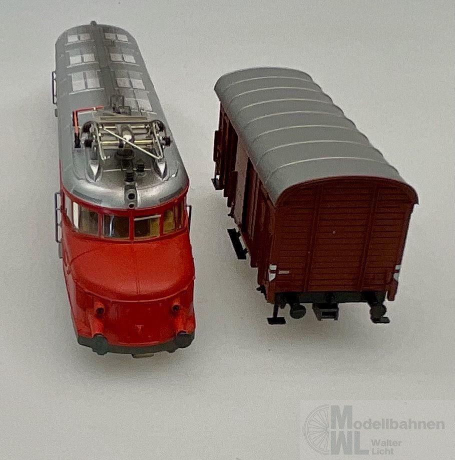 Scherenstromabnehmer mit schmalem Schleifstück. Spezial-Kuppelstange zum Kuppeln des Güterwagens K3. Gedeckter Güterwagen mit Bremserhaus K3 in rotbrauner Grundfarbgebung. Schiebetüren zum Öffnen. Gesamtlänge über Puffer 37 cm.