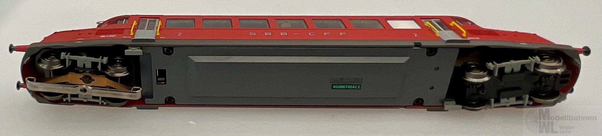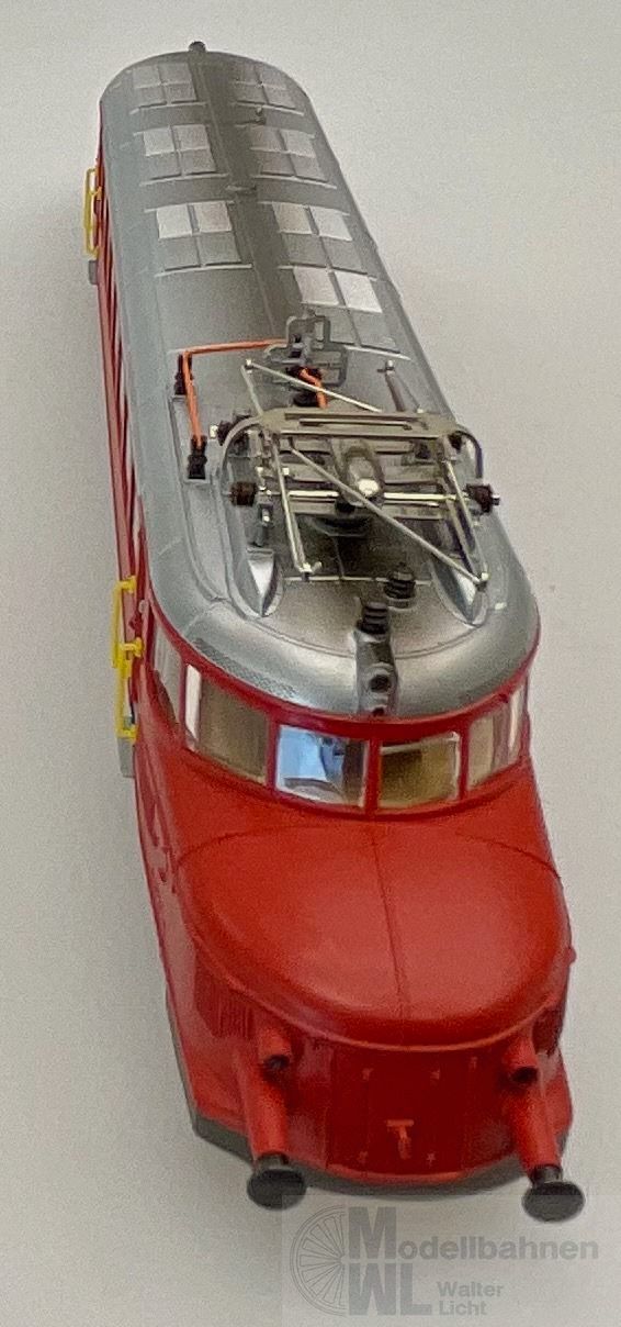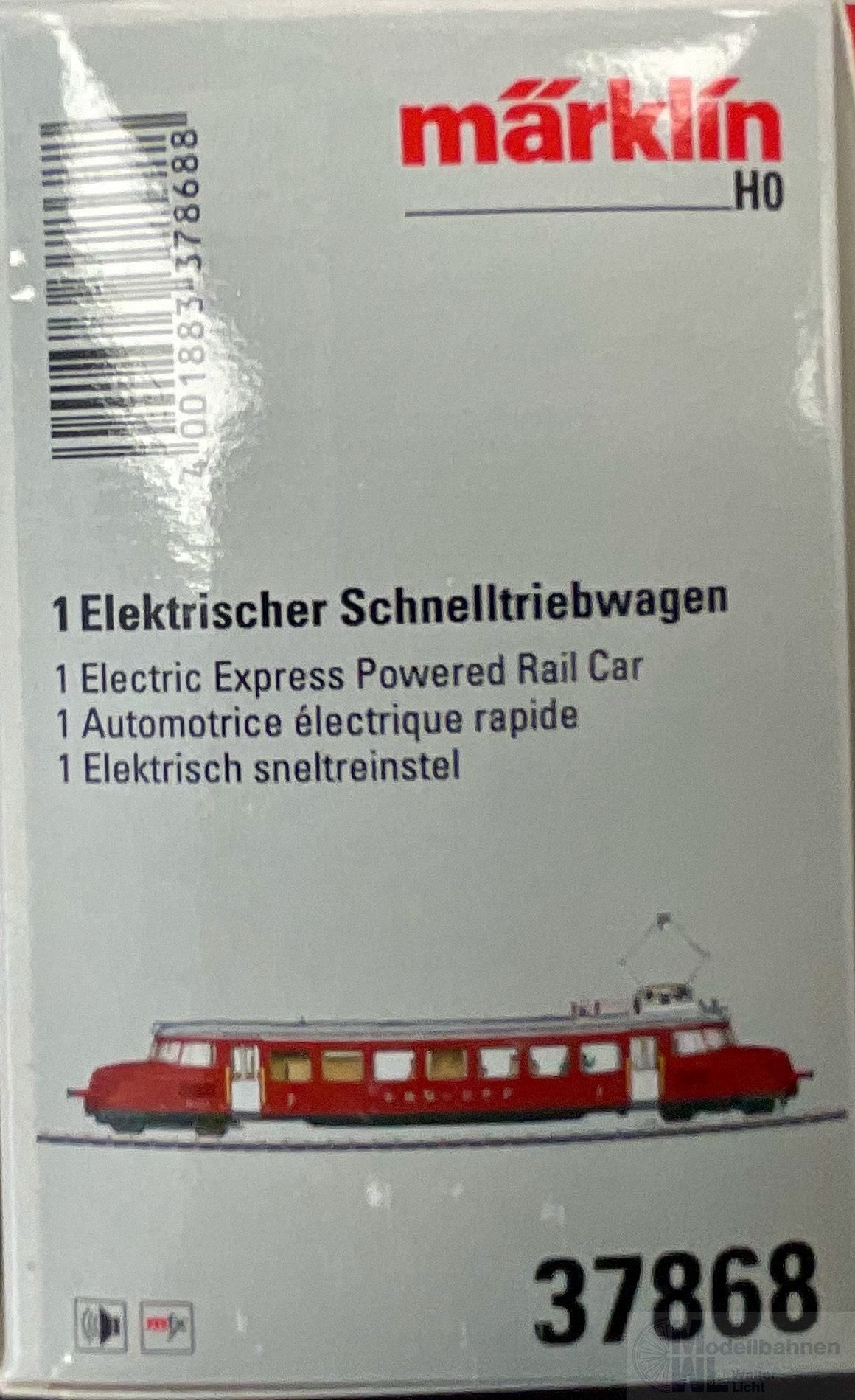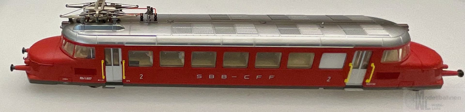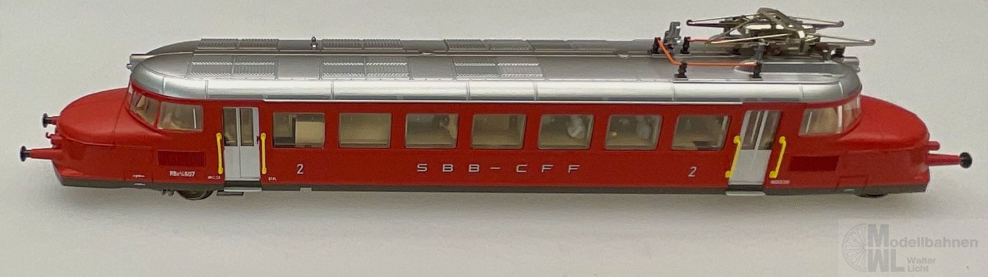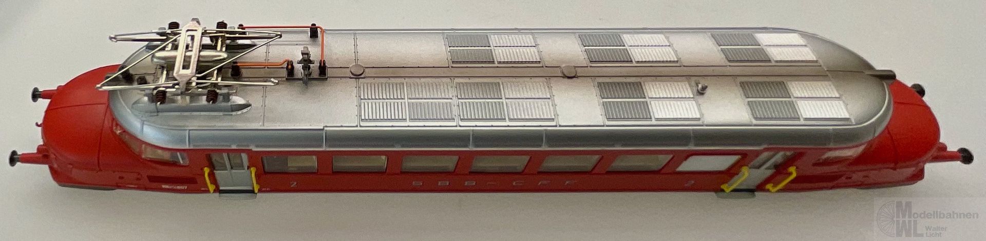 Modell: Mit mfx-Decoder und umfangreichen Geräuschfunktionen. Geregelter Hochleistungsantrieb. Spezialmotor mit Schwungmasse und Kardanwelle zum Treibgestell. 2 Achsen angetrieben. Haftreifen. Schweizer Lichtwechsel, 3-Licht-Spitzensignal und 1 weißes Schlusslicht konventionell in Betrieb, digital schaltbar. Zusätzlich kann auf ein rotes Schlusslicht umgeschaltet werden. Serienmäßig eingebaute Innenbeleuchtung. Spitzensignal und Innenbeleuchtung mit wartungsfreien warmweißen und roten Leuchtdioden (LED). Der Triebwagen ist serienmäßig mit einer Triebwagenführerfigur und zahlreichen Fahrgästen bestückt. Über die Funktionstasten können zusätzlich verschiedene Umgebungsgeräusche ausgelöst werden. Scherenstromabnehmer mit schmalem Schleifstück.