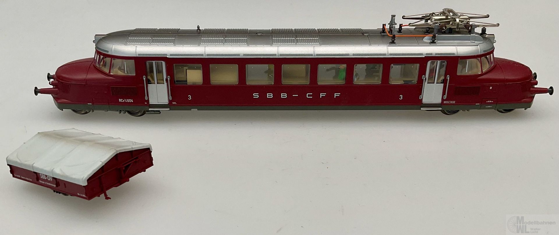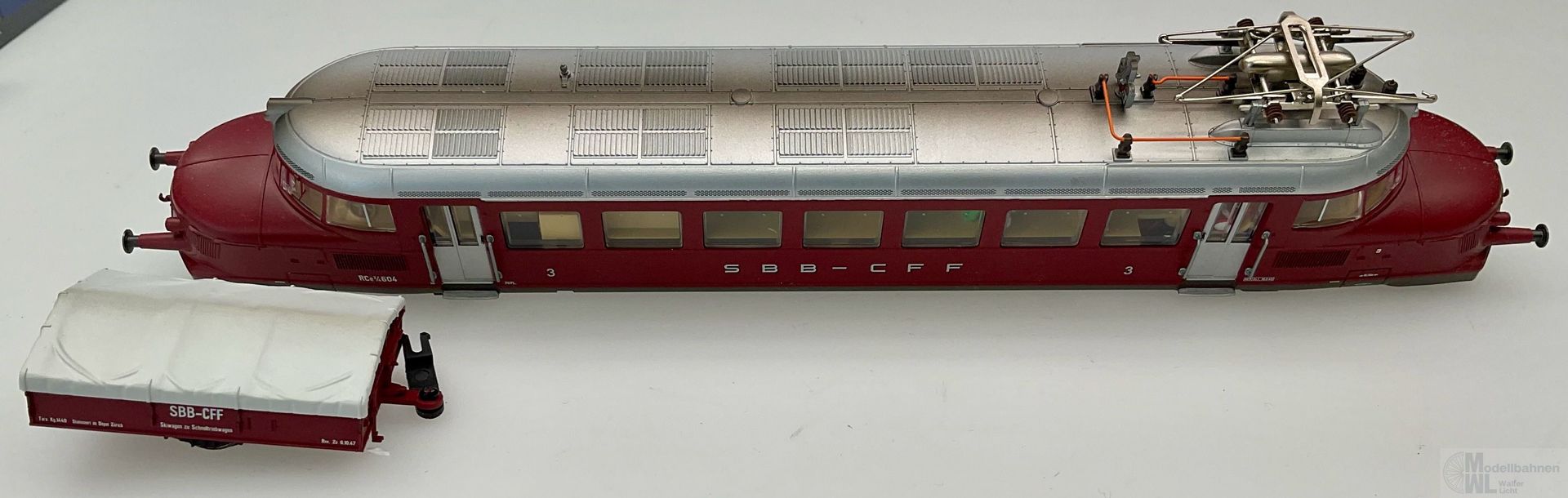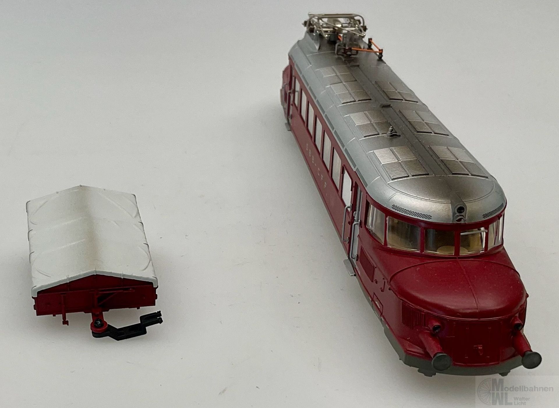 Modell: Mit Digital-Decoder mfx+ und umfangreichen Geräuschfunktionen. Geregelter Hochleistungsantrieb. Spezialmotor mit Schwungmasse und Kardanwelle zum Treibgestell. 2 Achsen angetrieben. Haftreifen. Schweizer Lichtwechsel, Dreilicht-Spitzensignal und 1 weißes Schlusslicht konventionell in Betrieb, digital schaltbar. Zusätzlich kann auf ein rotes Schlusslicht umgeschaltet werden. Serienmäßig eingebaute Innenbeleuchtung. Spitzensignal und Innenbeleuchtung mit wartungsfreien warmweißen und roten Leuchtdioden (LED). Der Triebwagen ist serienmäßig mit einer Triebwagenführerfigur und zahlreichen Fahrgästen bestückt. Über die Funktionstasten können zusätzlich verschiedene Umgebungsgeräusche ausgelöst werden. Einachs-Skianhänger mit entsprechender Spezialkupplung am Triebwagen angehängt.