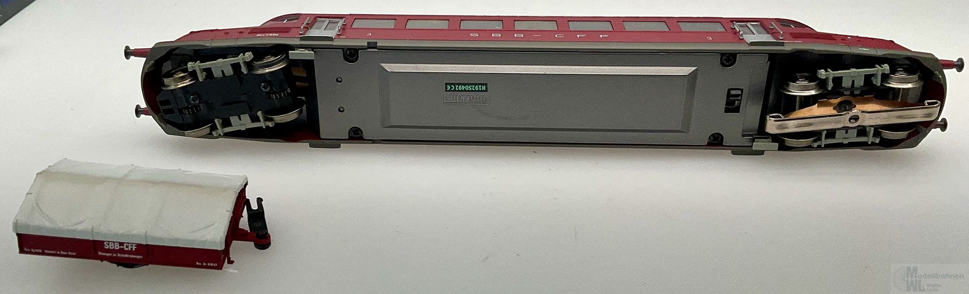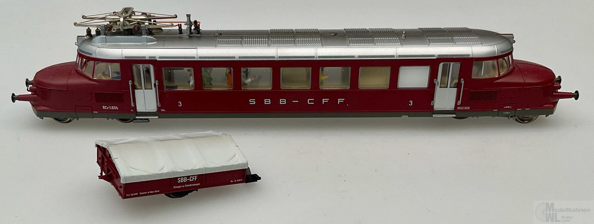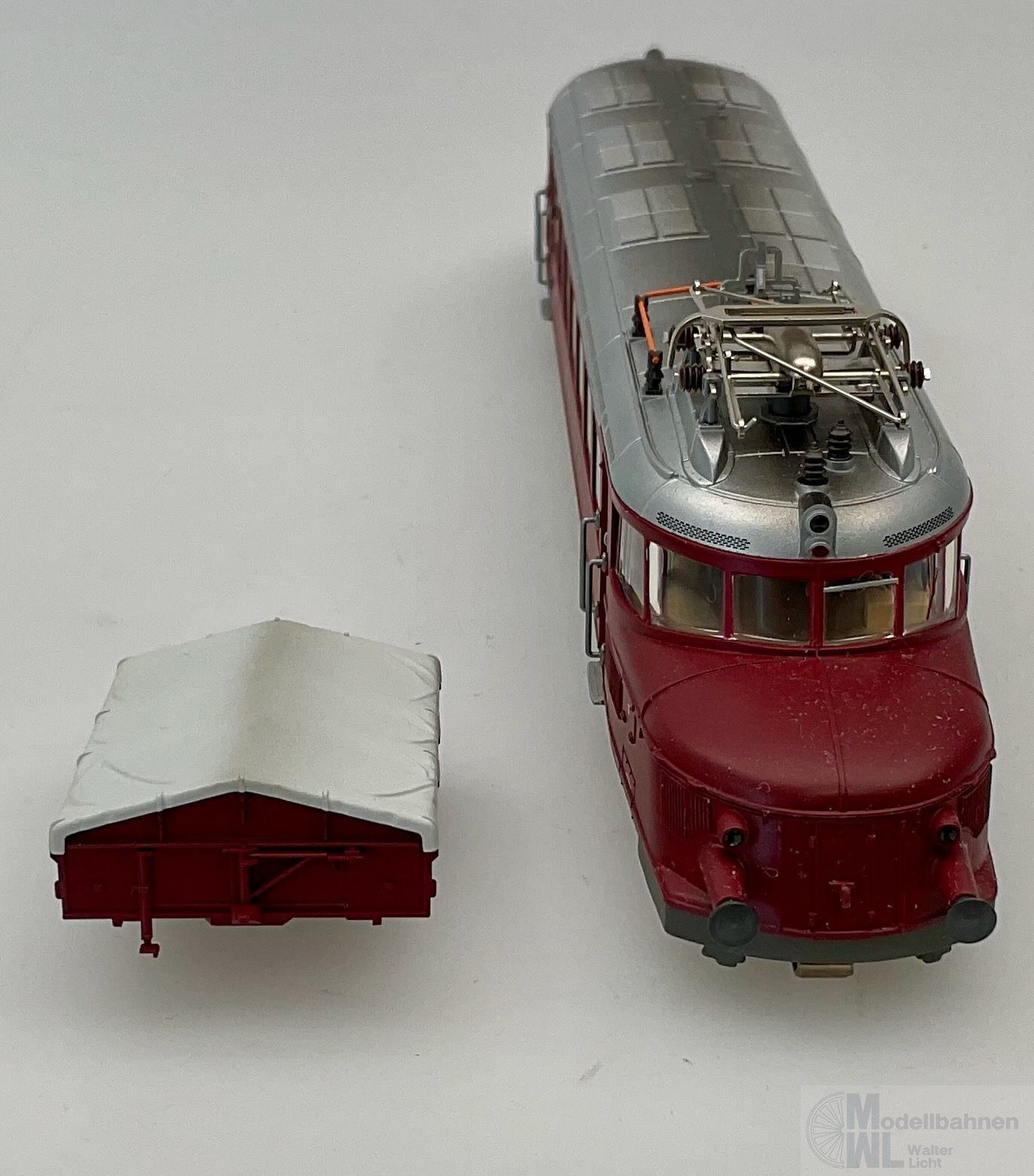 Modell: Mit Digital-Decoder mfx+ und umfangreichen Geräuschfunktionen. Geregelter Hochleistungsantrieb. Spezialmotor mit Schwungmasse und Kardanwelle zum Treibgestell. 2 Achsen angetrieben. Haftreifen. Schweizer Lichtwechsel, Dreilicht-Spitzensignal und 1 weißes Schlusslicht konventionell in Betrieb, digital schaltbar. Zusätzlich kann auf ein rotes Schlusslicht umgeschaltet werden. Serienmäßig eingebaute Innenbeleuchtung. Spitzensignal und Innenbeleuchtung mit wartungsfreien warmweißen und roten Leuchtdioden (LED). Der Triebwagen ist serienmäßig mit einer Triebwagenführerfigur und zahlreichen Fahrgästen bestückt. Über die Funktionstasten können zusätzlich verschiedene Umgebungsgeräusche ausgelöst werden. Einachs-Skianhänger mit entsprechender Spezialkupplung am Triebwagen angehängt.
