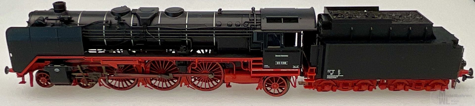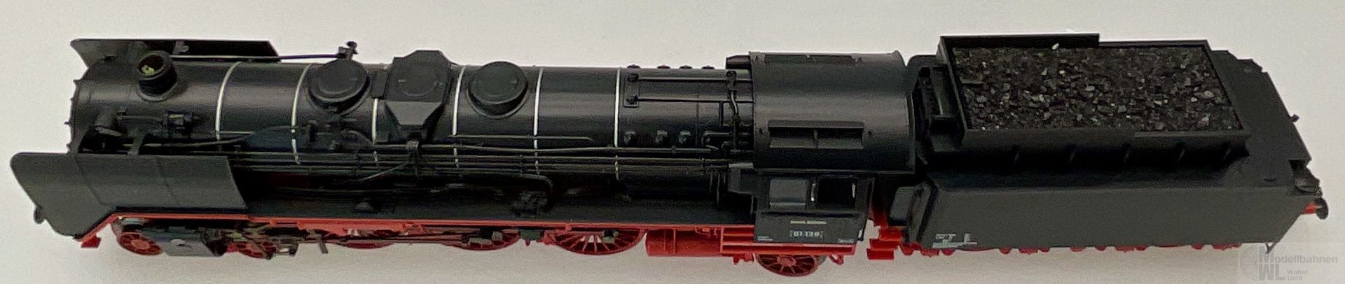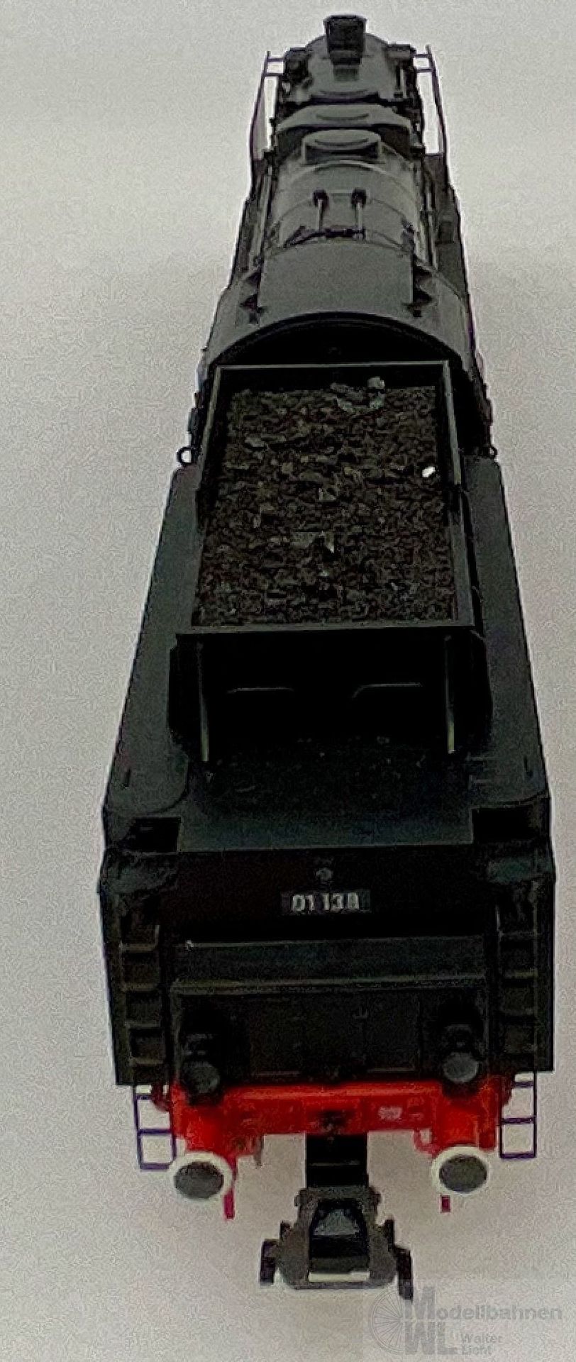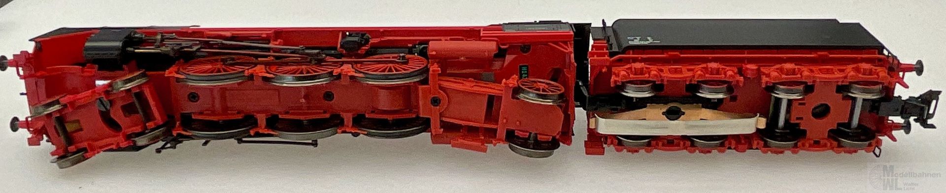 Modell: Mit neuem Digital-Decoder mfx+ und umfangreichen Geräuschfunktionen. Geregelter Hochleistungsantrieb mit Schwungmasse im Kessel. 3 Achsen angetrieben. Haftreifen. Lokomotive und Tender weitgehend aus Metall. Raucheinsatz aus 7226 ist serienmäßig eingebaut. Fahrtrichtungsabhängig wechselndes Zweilicht-Spitzensignal und Rauchsatz konventionell in Betrieb, digital schaltbar. Beleuchtung mit wartungsfreien warmweißen Leuchtdioden (LED). Gleisradiusbezogen verstellbare Kurzkupplung zwischen Lok und Tender. Am Tender kinematikgeführte Kurzkupplung mit NEM-Schacht. Im Tender ist eine Mechanik zum Absenken der Kohlenbeladung eingebaut, um damit im Spielewelt-Modus auch optisch den Kohlenverbrauch im Tender darzustellen. Für nicht mfx+ fähige Digital-Zentralen kann das Senken und Heben der Kohlenbeladung über Sonderfunktion F8 ausgelöst werden. Kolbenstangenschutzrohre, Bremsschläuche, Lokführer-Figur und Heizer-Figur liegen bei. Befahrbarer Mindestradius 360 mm.
