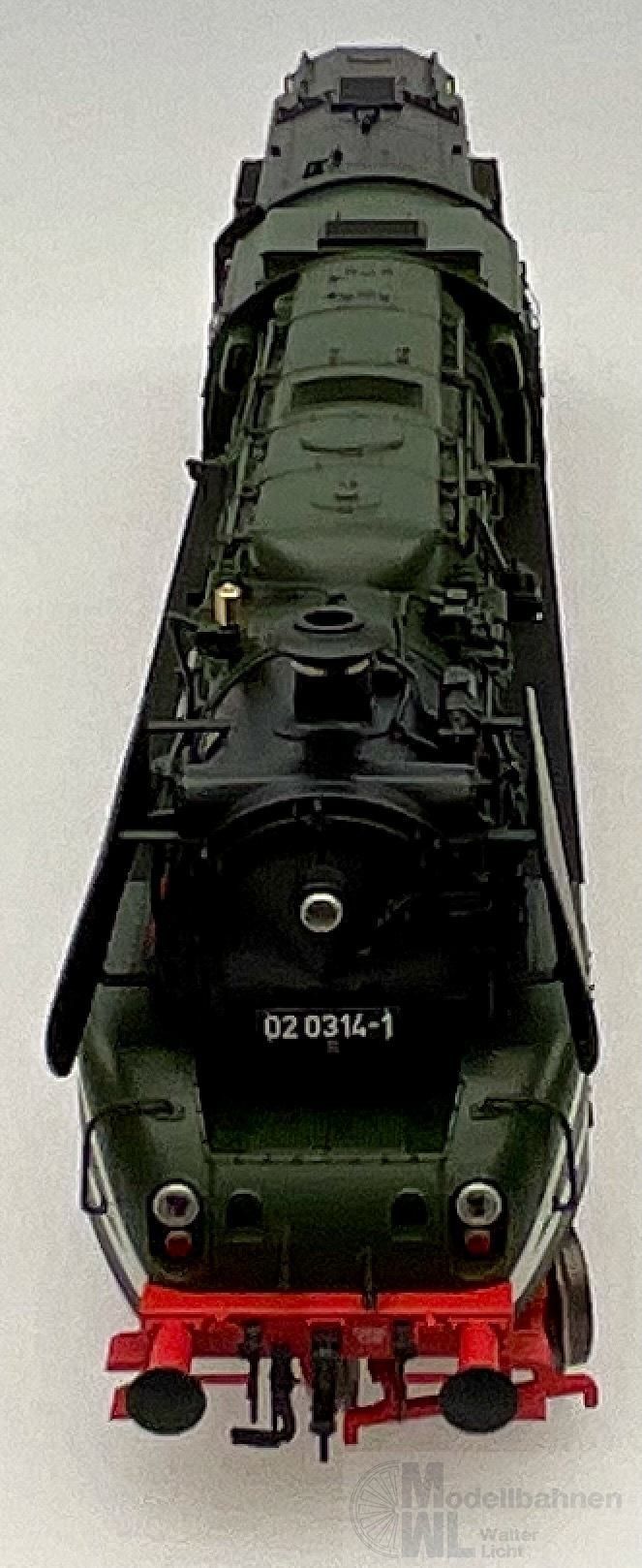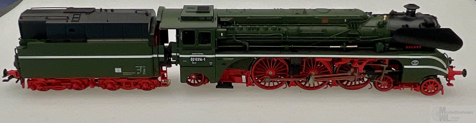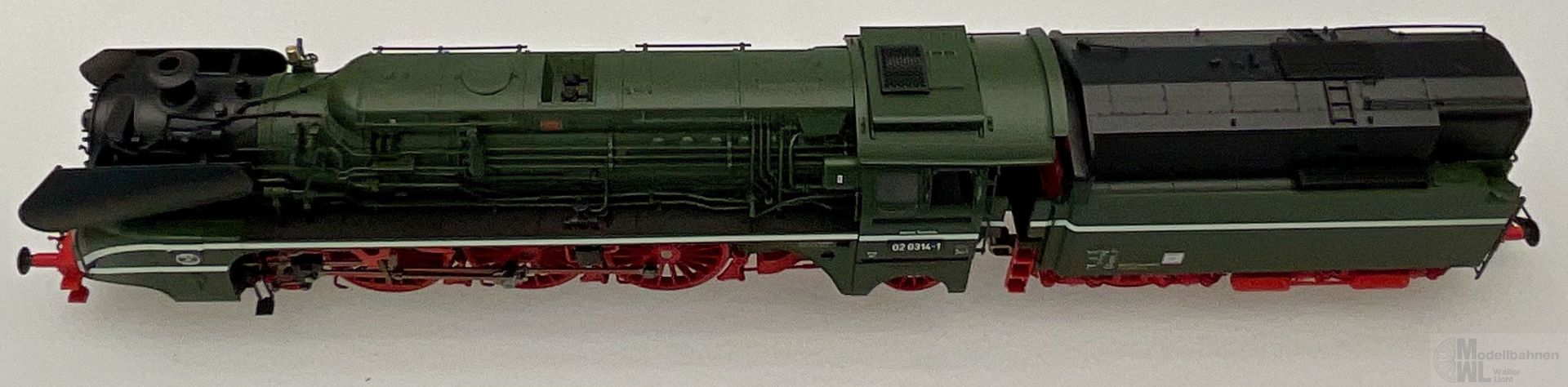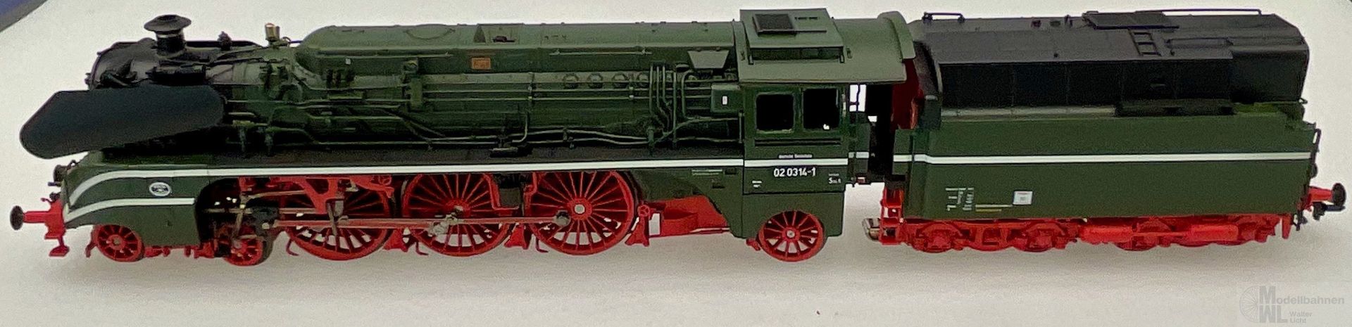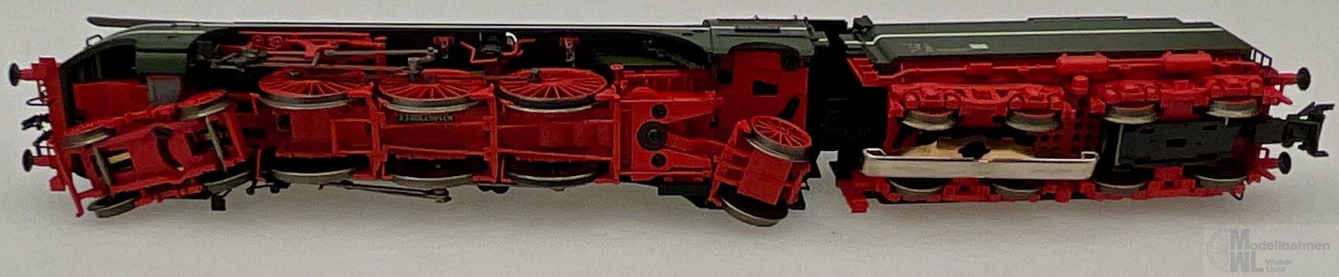 Modell: Mit Digital-Decoder mfx+ und umfangreichen Geräuschfunktionen. Geregelter Hochleistungsantrieb mit Schwungmasse im Kessel. 3 Achsen angetrieben. Haftreifen. Lokomotive und Tender weitgehend aus Metall. Serienmäßig eingebauter Raucheinsatz, mit geschwindigkeitsabhängigem, dynamischem Rauchausstoß. Fahrtrichtungsabhängig wechselndes Dreilicht-Spitzensignal konventionell in Betrieb, digital schaltbar. Zusätzlich sind vorne an der Lok zwei rote Lampen digital schaltbar. Führerstandbeleuchtung und Fahrwerkbeleuchtung separat digital schaltbar. Beleuchtung mit wartungsfreien warmweißen und roten Leuchtdioden (LED). Kurzkupplung mit Kinematik zwischen Lok und Tender. Am Tender kinematikgeführte Kurzkupplung mit NEM-Schacht. Befahrbarer Mindestradius 360 mm. Für große Radien oder Vitrine liegt eine Verkleidung ohne Radausschnitt unterhalb des Führerhauses zum Austausch bei. Kolbenstangenschutzrohre und Bremsschläuche liegen ebenfalls bei.