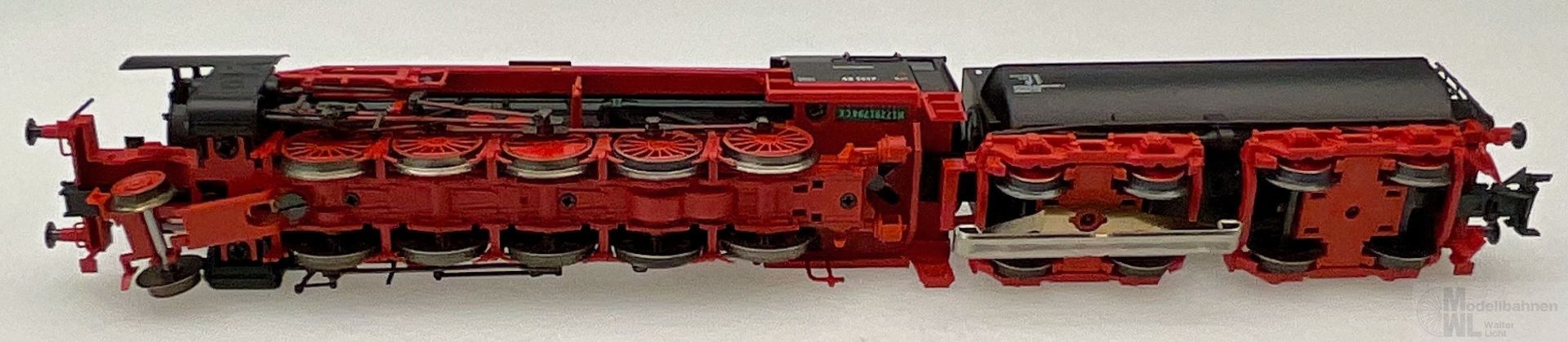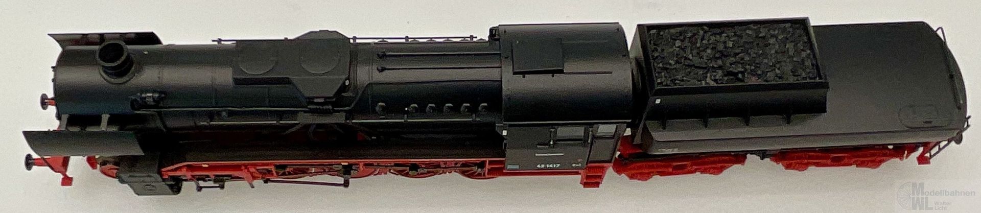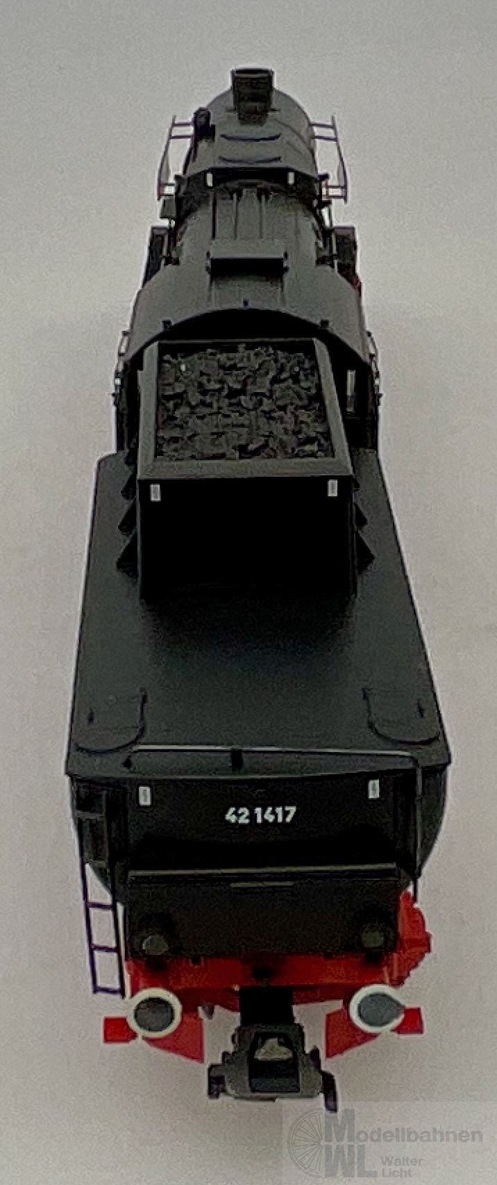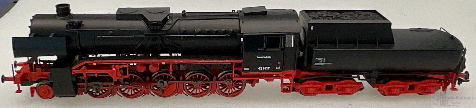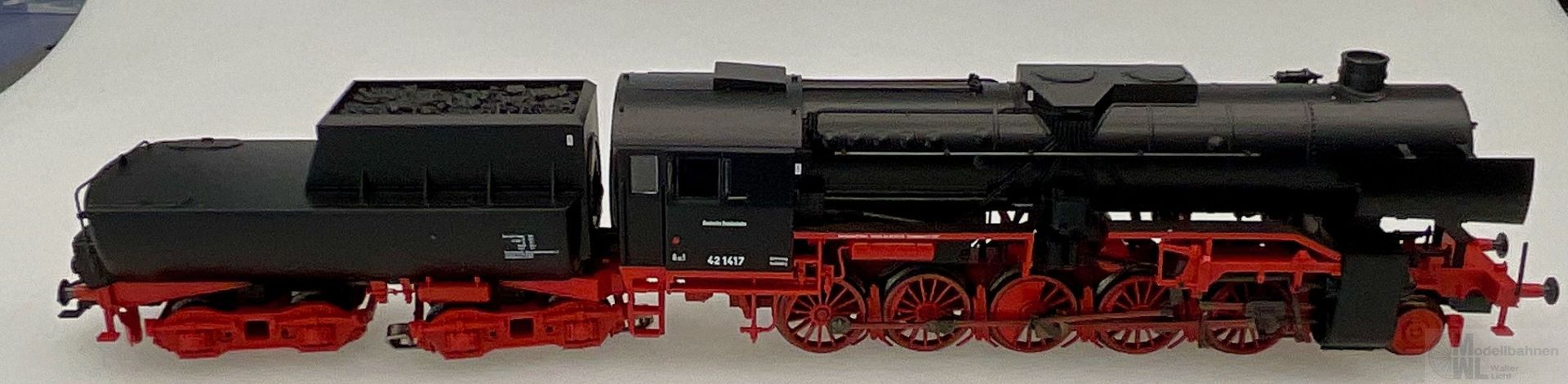 Modell: Mit Digital-Decoder mfx+ und umfangreichen Geräuschfunktionen. Geregelter Hochleistungsantrieb mit Schwungmasse im Kessel. 5 Achsen angetrieben. Haftreifen. Lokomotive und Wannentender weitgehend aus Metall. Eingerichtet für Rauchsatz 7226. Fahrtrichtungsabhängig wechselndes Zweilicht-Spitzensignal und nachrüstbarer Rauchsatz konventionell in Betrieb, digital schaltbar. Führerstandbeleuchtung zusätzlich digital schaltbar. Beleuchtung mit wartungsfreien warmweißen Leuchtdioden (LED). Kurzkupplung mit Kinematik zwischen Lok und Tender. Hinten am Tender und vorne an der Lok kinematikgeführte Kurzkupplung mit NEM-Schacht. Befahrbarer Mindestradius 360 mm. Kolbenstangenschutzrohre, Bremsschläuche und Schraubenkupplungsimitationen liegen bei.