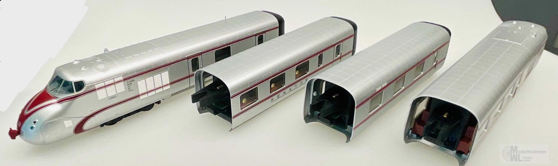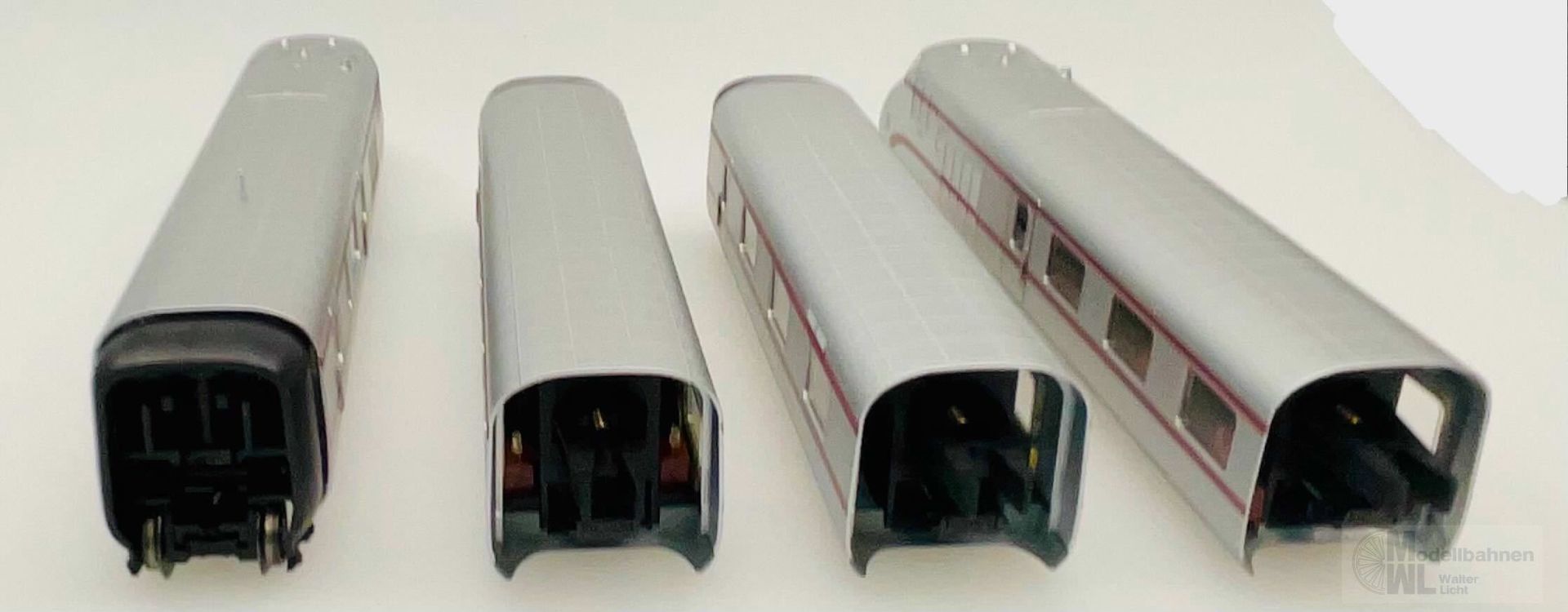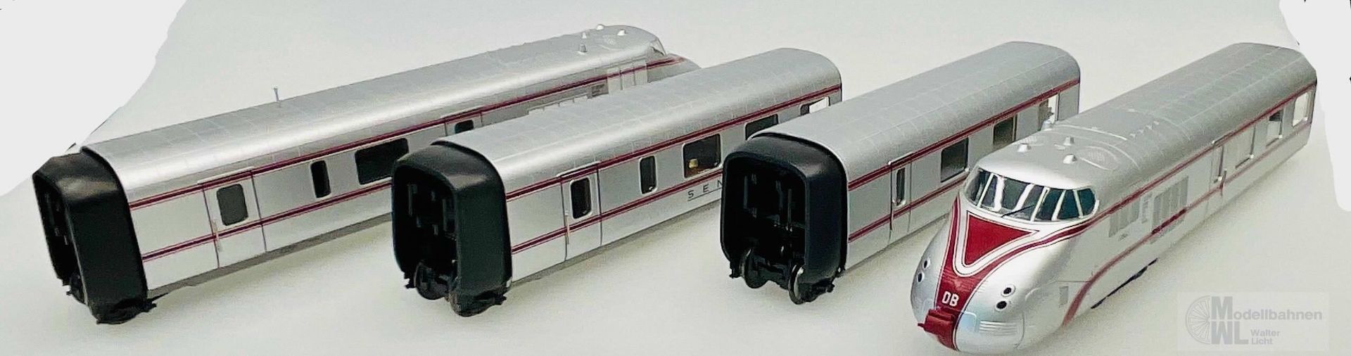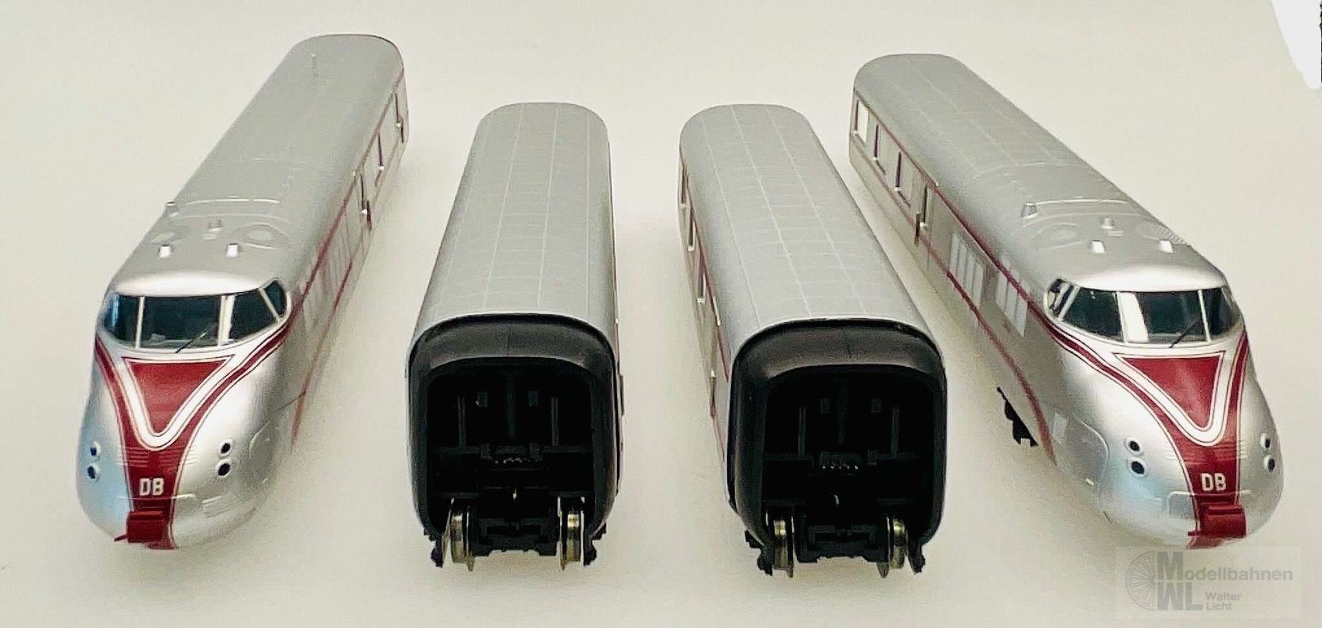 Modell: Mit Digital-Decoder mfx, geregeltem Hochleistungsantrieb Softdrive Sinus und Geräuschgenerator im Triebwagen A. Wartungsfreier Motor in kompakter Bauform. 2 Achsen im Drehgestell des Triebwagens A angetrieben. Haftreifen. Zweilicht-Spitzensignal und rote Schlusslichter, Innenbeleuchtung und Tischlampen mit wartungsfreien, warmweißen Leuchtdioden konventionell in Betrieb, digital schaltbar. Mehrpolige Strom führende Spezialkupplung und dicht schließende Übergangsblenden zwischen den Fahrzeugen. Schleiferumschaltung. An den Enden Nachbildung der abgedeckten Scharfenberg-Kupplung (ohne Funktion). Zuglänge über Kupplungen 69,1 cm.