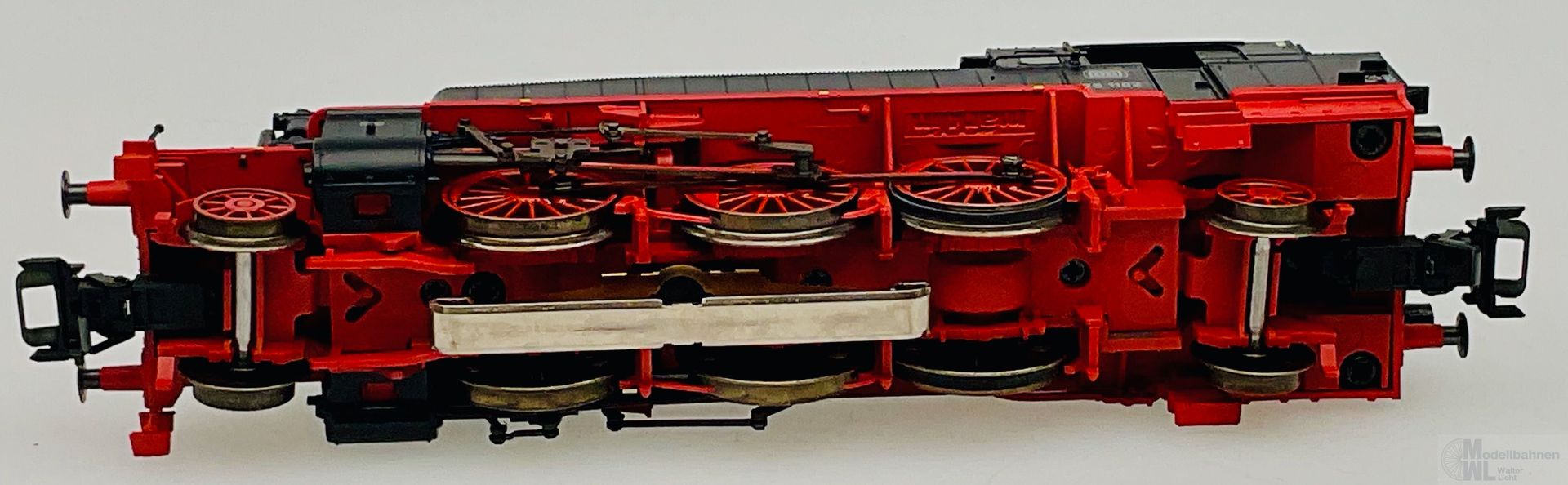 Modell: Mit Digital-Decoder mfx+ und umfangreichen Geräuschfunktionen. Geregelter Hochleistungsantrieb mit Schwungmasse im Kessel. 3 Achsen angetrieben. Haftreifen. Lokomotive weitgehend aus Metall. Serienmäßig eingebauter Rauchsatz. Fahrtrichtungsabhängig wechselndes Dreilicht-Spitzensignal und eingebauter Rauchsatz konventionell in Betrieb, digital schaltbar. Beleuchtung mit wartungsfreien warmweißen Leuchtdioden (LED). Zahlreiche angesetzte Griffstangen und Leitungen aus Metall. Befahrbarer Mindestradius 360 mm. Kolbenstangenschutzrohre und Bremsschläuche liegen bei. Länge über Puffer 14,6 cm.