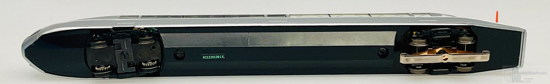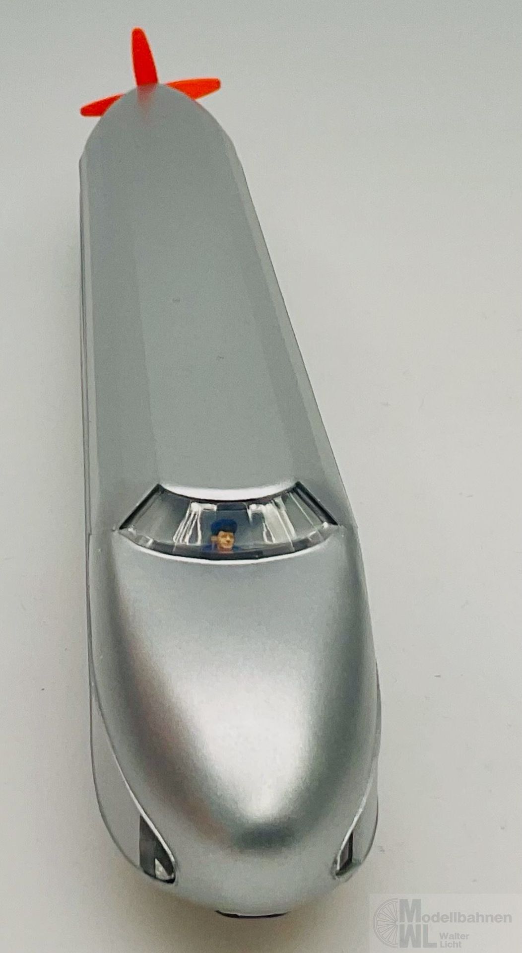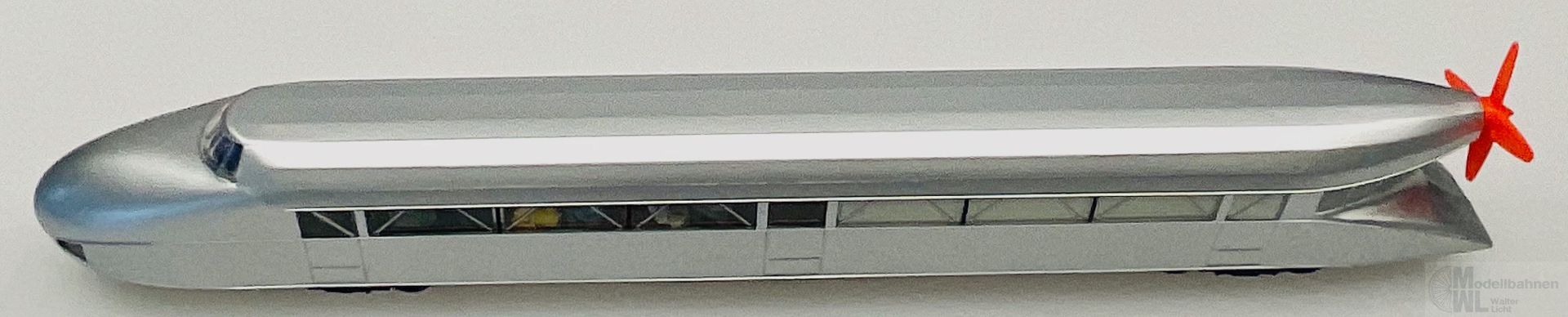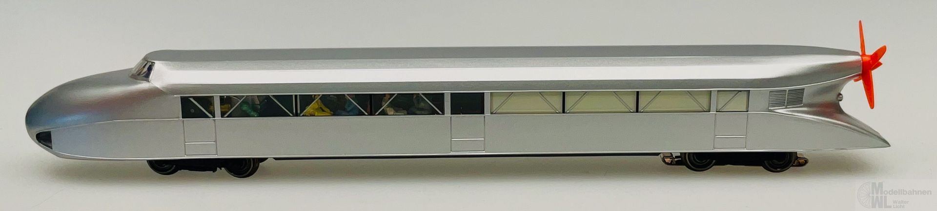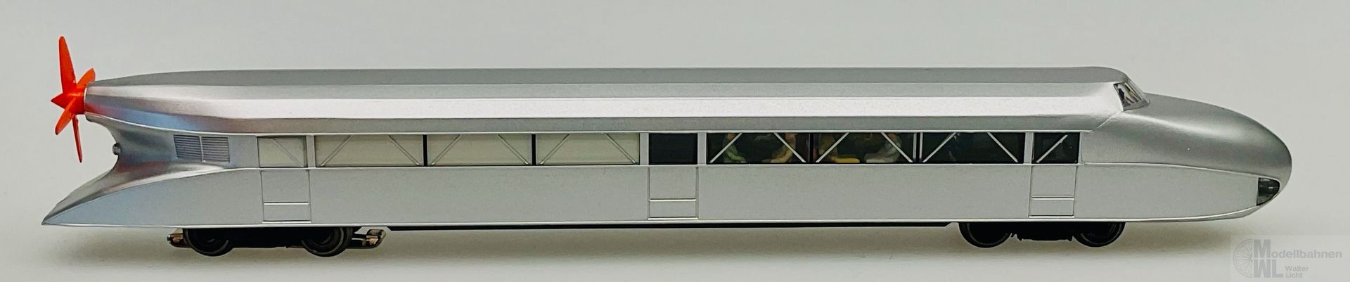 Modell: Wiederauflage eines Märklin-Klassikers. Mit Digital-Decoder mfx mit umfangreichen Geräuschfunktionen. Geregelter Hochleistungsantrieb. 2 Achsen angetrieben. Haftreifen. Fahrtrichtungsabhängig wechselndes Zweilicht-Spitzensignal und ein rotes Schlusslicht konventionell in Betrieb, digital schaltbar. Serienmäßig eingebaute Innenbeleuchtung konventionell in Betrieb, separat digital schaltbar. Führerstandsbeleuchtung separat digital schaltbar. Beleuchtung mit wartungsfreien warmweißen und roten Leuchtdioden (LED). Heckpropeller separat digital schaltbar, konventionell in Betrieb. Bei Rangier- und Rückwärtsfahrt ist ein Elektromotor zu hören, der Propeller ist aus. Lokführerfigur im Führerstand. Inneneinrichtung mit Miniatur-Figuren als Reisende bestückt.