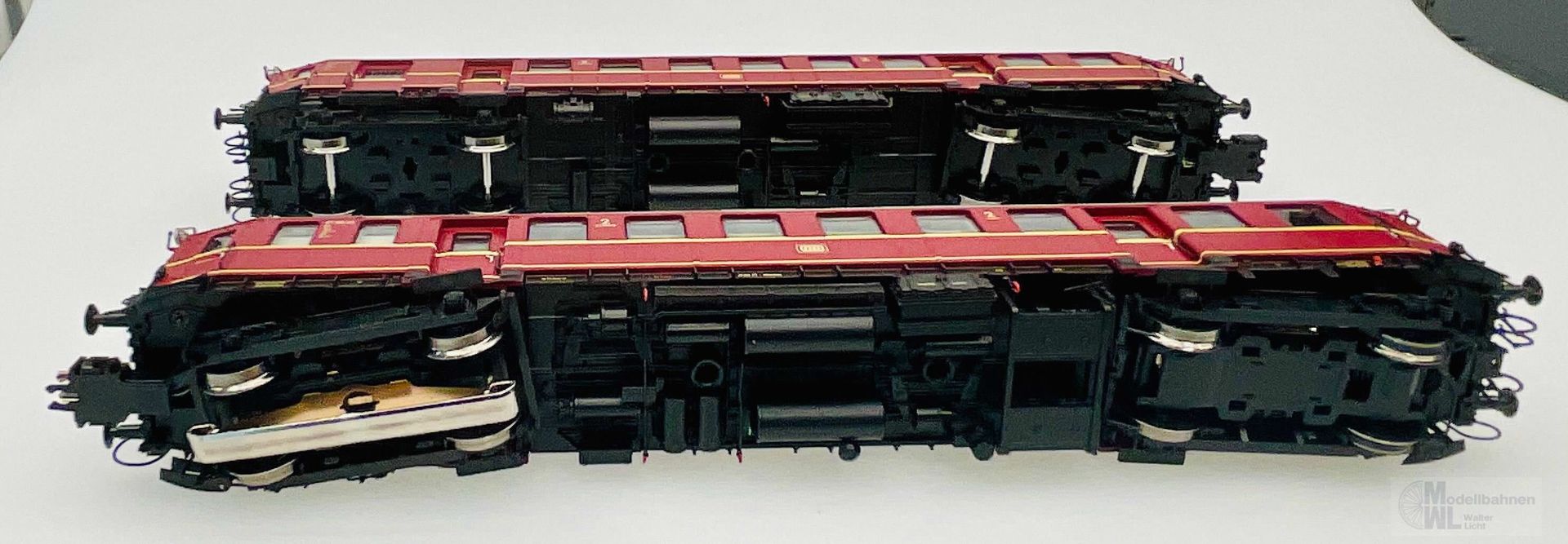 Sehr detaillierte Ausführung von Fahrwerk und Aufbau. Wagenkasten und Wagenboden aus Metall.
