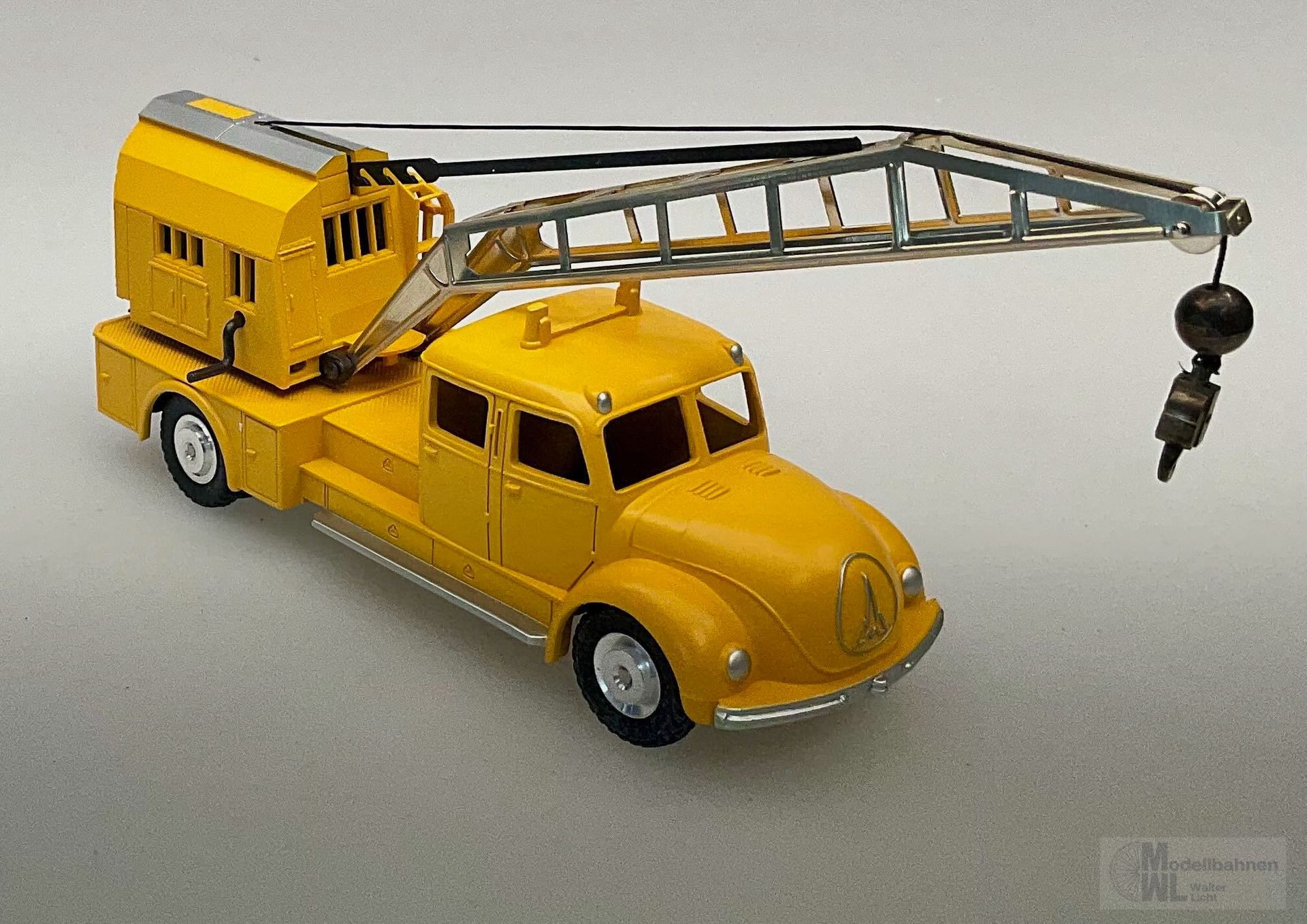 Modell: Aufbau des Autokrans aus Metall-Druckguss, Boden aus Stahlblech. Metallräder als Drehteile mit Gummireifen. Kranhausdach, Stoßstangen und Scheinwerfer farblich abgesetzt. Mit vielen Funktionen, wie drehbarem Krangehäuse, verstellbarem Ausleger und heb- und senkbarem Kranhaken. Länge ca. 18,0 cm.